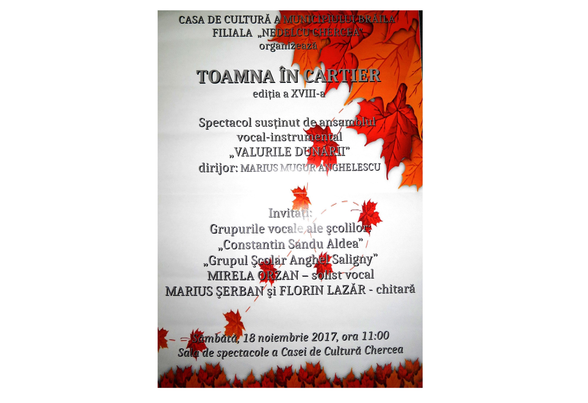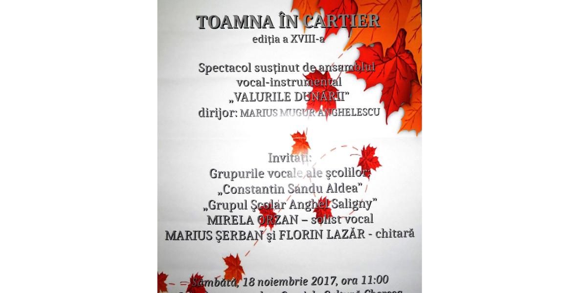 Weekendul acesta, brăilenii sunt invitaţi să sărbătorească ultimele zile de toamnă la Casa de Cultură “Nedelcu Chercea”. Sâmbătă, 18 noiembrie, începând cu ora 11.00, se dă startul celei de-a XVIII-a ediţii a evenimentului “Toamna în cartier”, organizat de Ansamblul vocal instrumental “Valurile Dunării”.