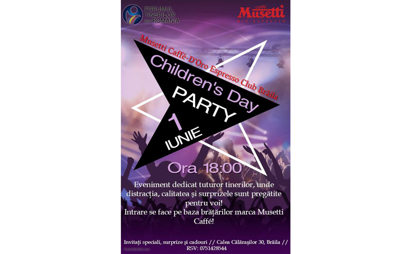 “Children's Day Party” va avea loc pe 1 iunie, la Musetti Caffe, Calea Călăraşilor nr. 30, începând cu ora 18.00. Accesul la eveniment se va face în baza unor brăţări marca Musetti Caffé. Preţul acestora este de 10 lei şi vor fi distribuite prin licee, de către organizatori.