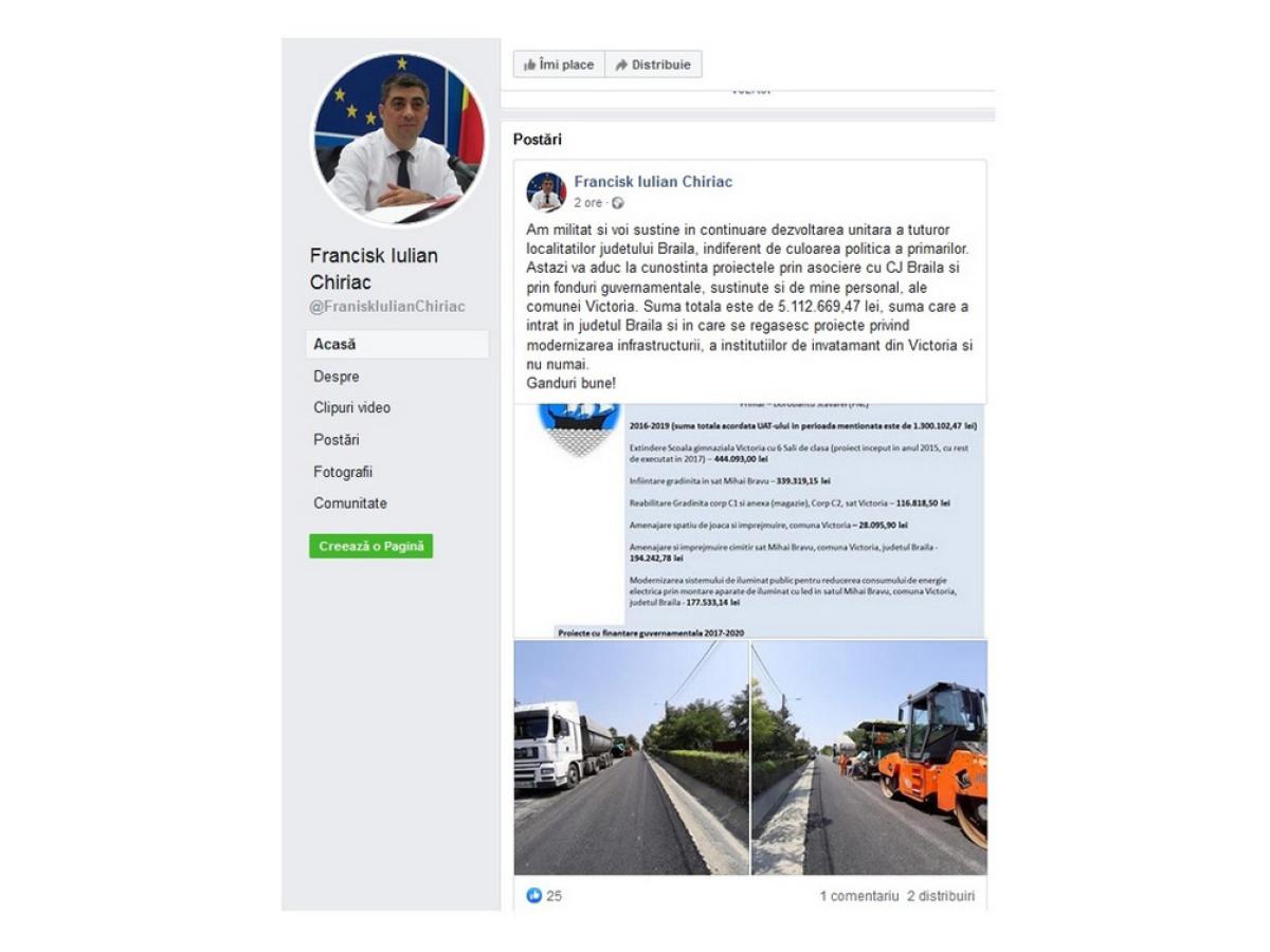 • preşedintele Consiliului Judeţean Brăila, Francisk Chiriac, a postat, ieri, pe reţelele de socializare un mesaj privind mai multe proiecte investiţionale făcute de comuna Victoria (primar PNL) în timpul mandatului său • şeful CJ a încercat să sublinieze astfel faptul că a alocat bani fără să ţină cont de culoarea politică • potrivit acestuia, în perioada 2016-2019, Victoria a avut proiecte cofinanţate cu suma de 5.112.669 lei