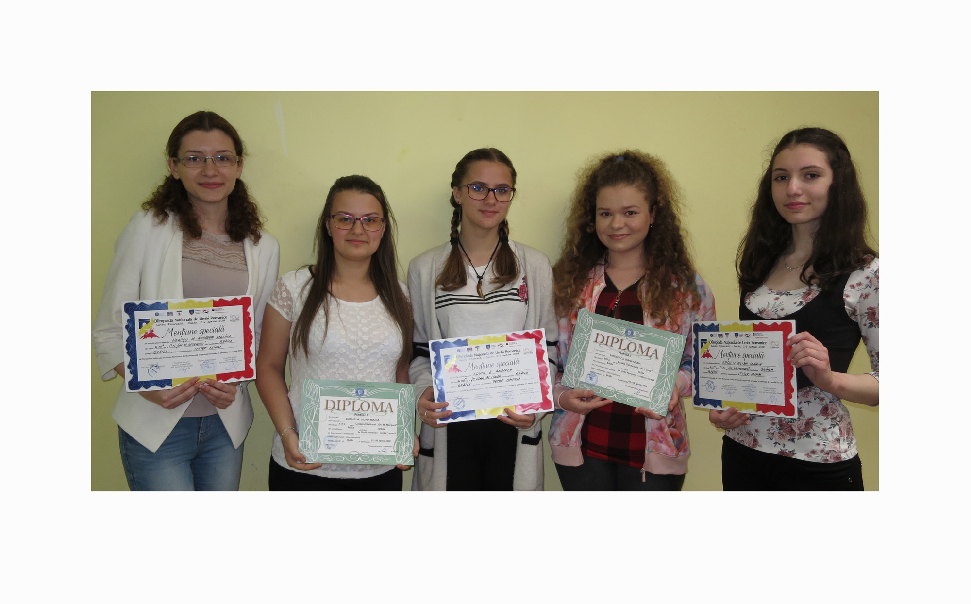 Cinci concurente şi tot atâtea premii! Ediţia din acest an a Olimpiadei Naţionale de Limba Franceză a fost un succes pe toată linia pentru elevele noastre, un premiu I, un premiu II şi trei menţiuni speciale fiind palmaresul remarcabil obţinut de acestea la competiţia organizată la Buzău, în perioada 2-6 aprilie. Astfel,