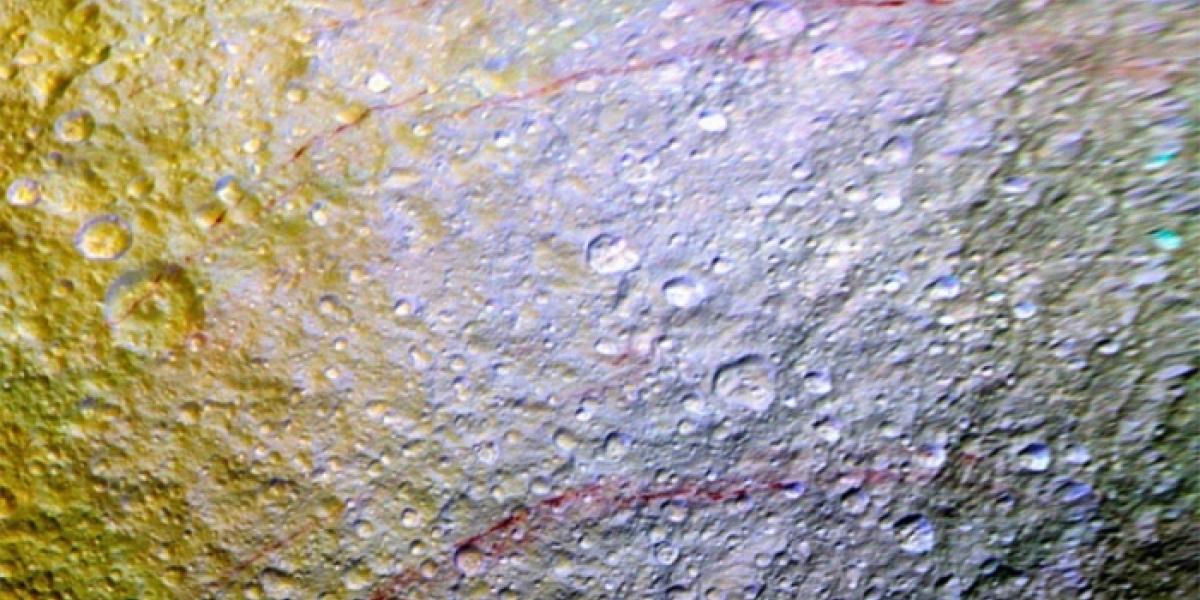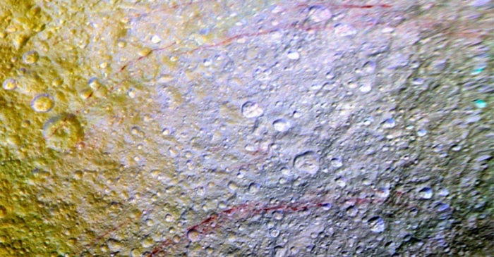 „Sunt unele dintre cele mai neobișnuite imagini color obținute de camerele de luat vederi de pe Cassini", a afirmat NASA în legătură cu fotografiile suprafeței înghețate a acestui satelit, realizate cu filtre speciale verzi, infraroșii și ultraviolete. Pozele au fost combinate astfel încât permit sesizarea, la lungimi de undă vizibile pentru ochiul omenesc, a unor diferențe mici de culoare de pe suprafața lui Tethys.