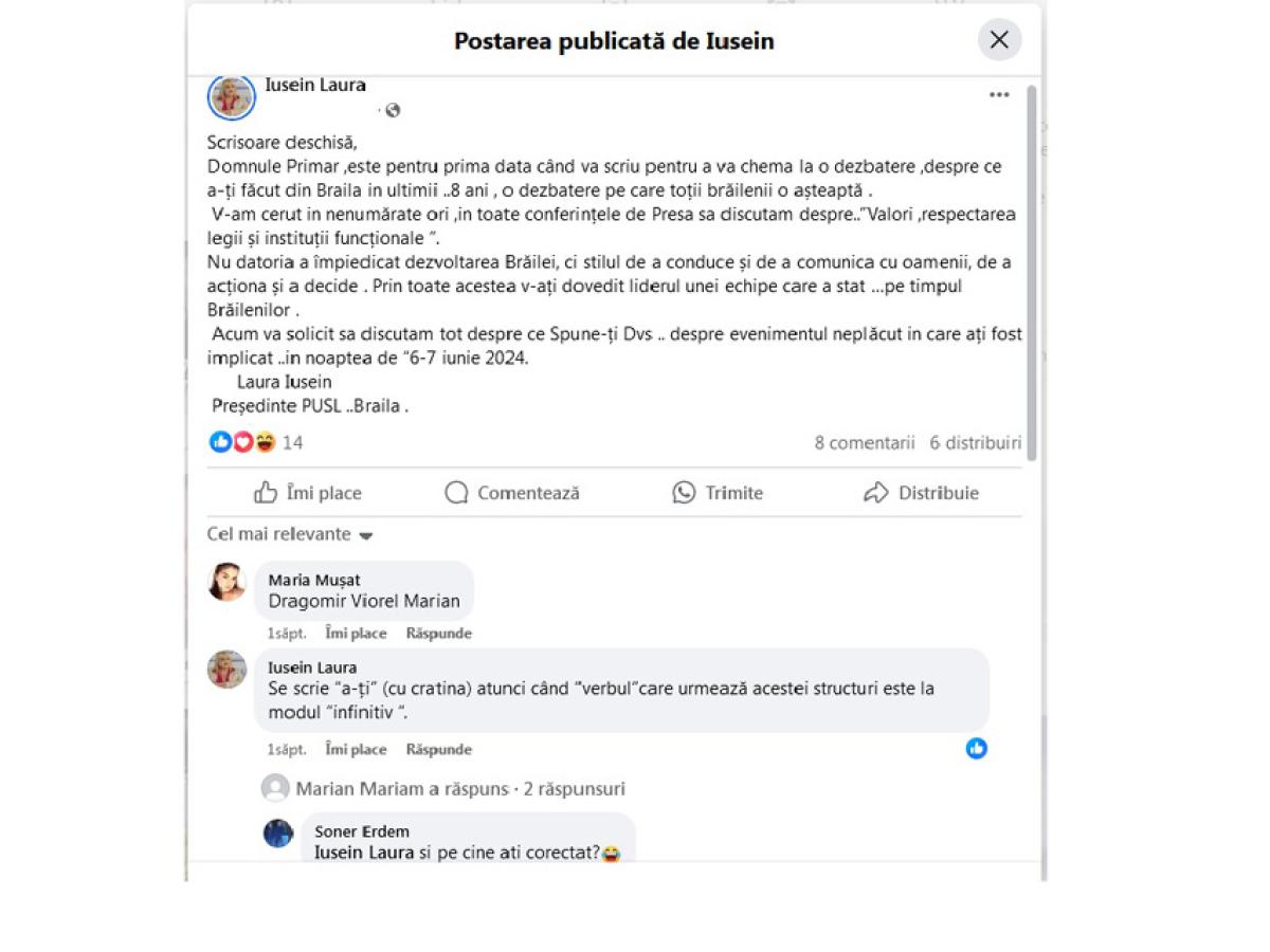Ea este Laura... Laura Iusein, această james-bondină a alegerilor locale, această gramaticală doamnă care reinventează gramatica Limbii Române și, și mai și, se bate pe umeri cu Marcel Ciolacu. ”Eu personal o să-l sun pe domnul prim-ministru Ciolacu, dacă dumnealui încă nu a fost informat de ceea ce s-a întâmplat la Brăila, o să-l informez eu, pentru că sunt convinsă că nu va accepta să-și asocieze numele cu aceștia”. ”Aceștia” fiind, în principal, primarul Marian Dragomir. Acuma, sincer, o fi făcut armata împreună cu Marcel Ciolacu de-și permite ea, Laura, să-l sune pe ditai premierul și să-l ia la întrebări?! Tot ea, Laura Iusein, a făcut apel la brăileni să iasă la vot în număr cât mai mare la alegerile din 9 iunie, ca să ia puterea din mâna PSD. Sigur, au ieșit destui brăileni la vot numai că ea, Laura de la PUSL (partidul securistului Voiculescu și al lui Piedone care și-a plantat fiul la primăria sectorului 5, cel care a avut partea lui de vină în dosarul Colectiv) a luat praful de pe tobă – la voturi ne referim. Poate, cine știe, cineva cu dare de mână i-o fi mulțumit în vreun fel pentru activismul ei din timpul campaniei electorale și pentru ghearele, la propriu, afișate prin conferințele de presă...Asta ar explica ”triunful” doamnei cu pricina, director de marketing la o firmă pe care, parol, n-am găsit-o! În fine, om fi noi prost căutători... Jungle Corp, se cheamă corporația sau ce-o fi... de negăsit pentru niște proști ca noi. În consecință, vă rugăm, doamnă, nu trageți în noi, în caz că v-a dat vreun influencer un pistol cu apă chioară. (PA și PU la gară)