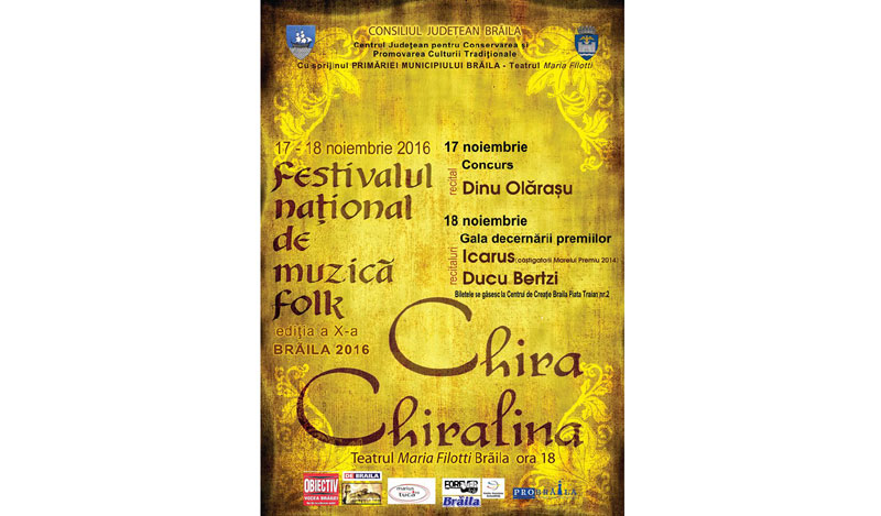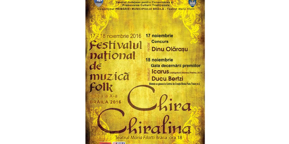 Cea de a X-a ediţie a Festivalului Naţional de folk „ Chira Chiralina” de la Brăila se va desfăşura în perioada 17-18 noiembrie 2016, începând cu ora 18.00, la Teatrul „Maria Filotti”.