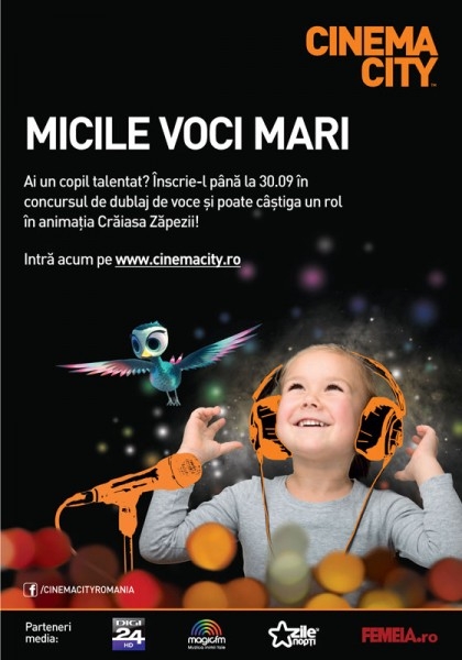 În luna septembrie, în cadrul celei mai noi campanii dedicate copiilor entuziaşti şi ambitioşi, dornici să ajungă viitoare staruri, care au între 8 şi 16 ani, Cinema City caută „Micile Voci Mari", oferindu-le acestora ocazia extraordinară de a dubla două personaje dintr-un celebru film de animaţie.