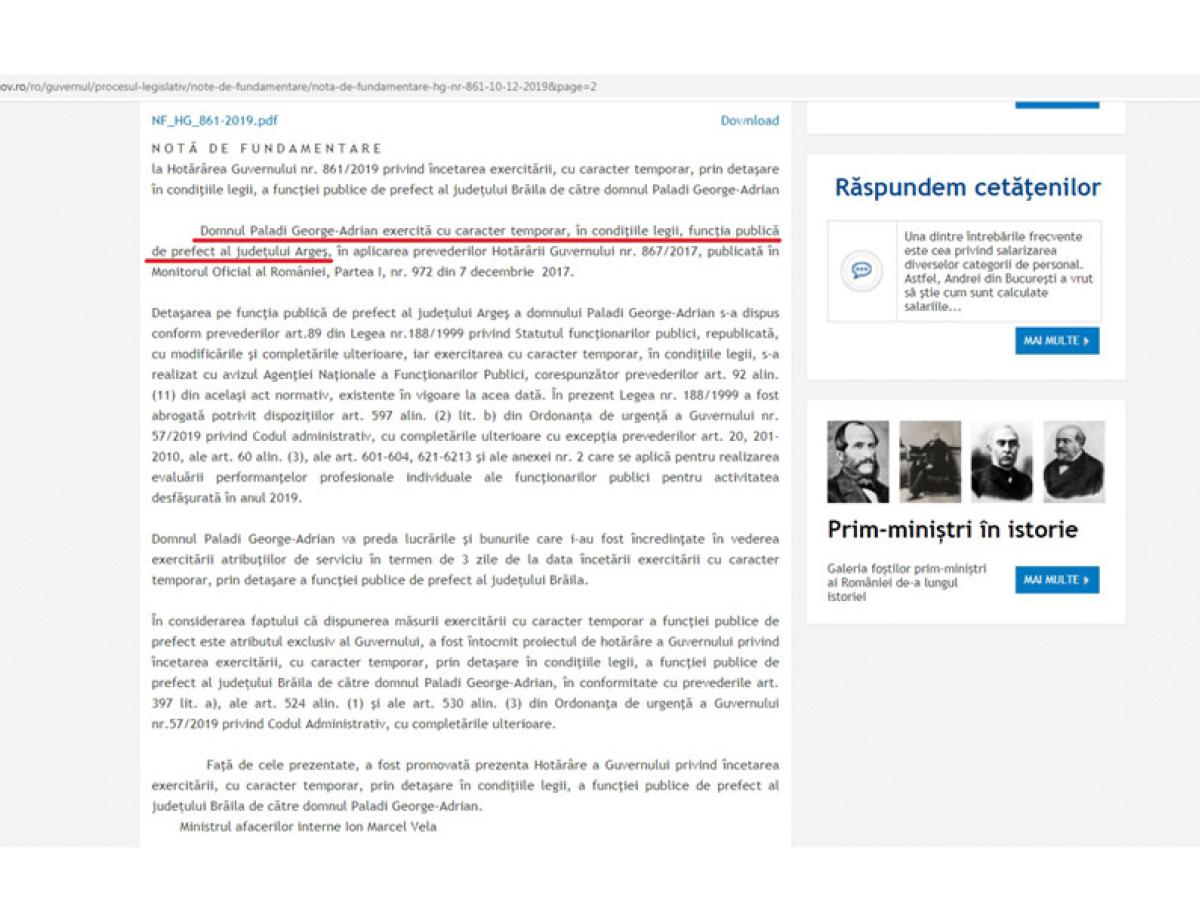 Mai mult, surse din administraţie susţin că demiterea fostului prefect, George Adrian Paladi, s-ar fi făcut în mod ilegal, în Nota de Fundamentare strecurându-se o greşeală. Mai exact, în documentul postat pe site-ul Guvernului, apare că Paladi a fost prefectul judeţului Argeş: “Domnul Paladi George-Adrian exercită cu caracter temporar, în condiţiile legii, funcţia publică de prefect al judeţului Argeş, în aplicarea prevederilor Hotărârii Guvernului nr. 867/2017, publicată în Monitorul Oficial al României, Partea I, nr. 972 din 7 decembrie 2017”, este fraza care a atras atenţia. În schimb, în restul documentului, informaţia este corectă, Paladi fiind nominalizat ca prefect al judeţului Brăila.