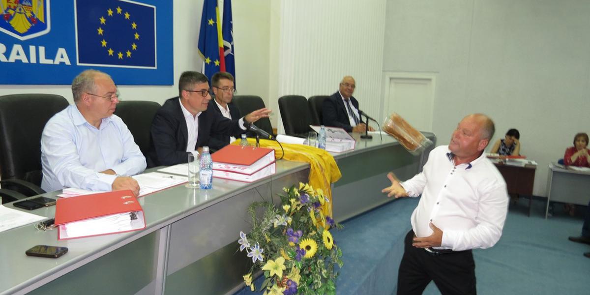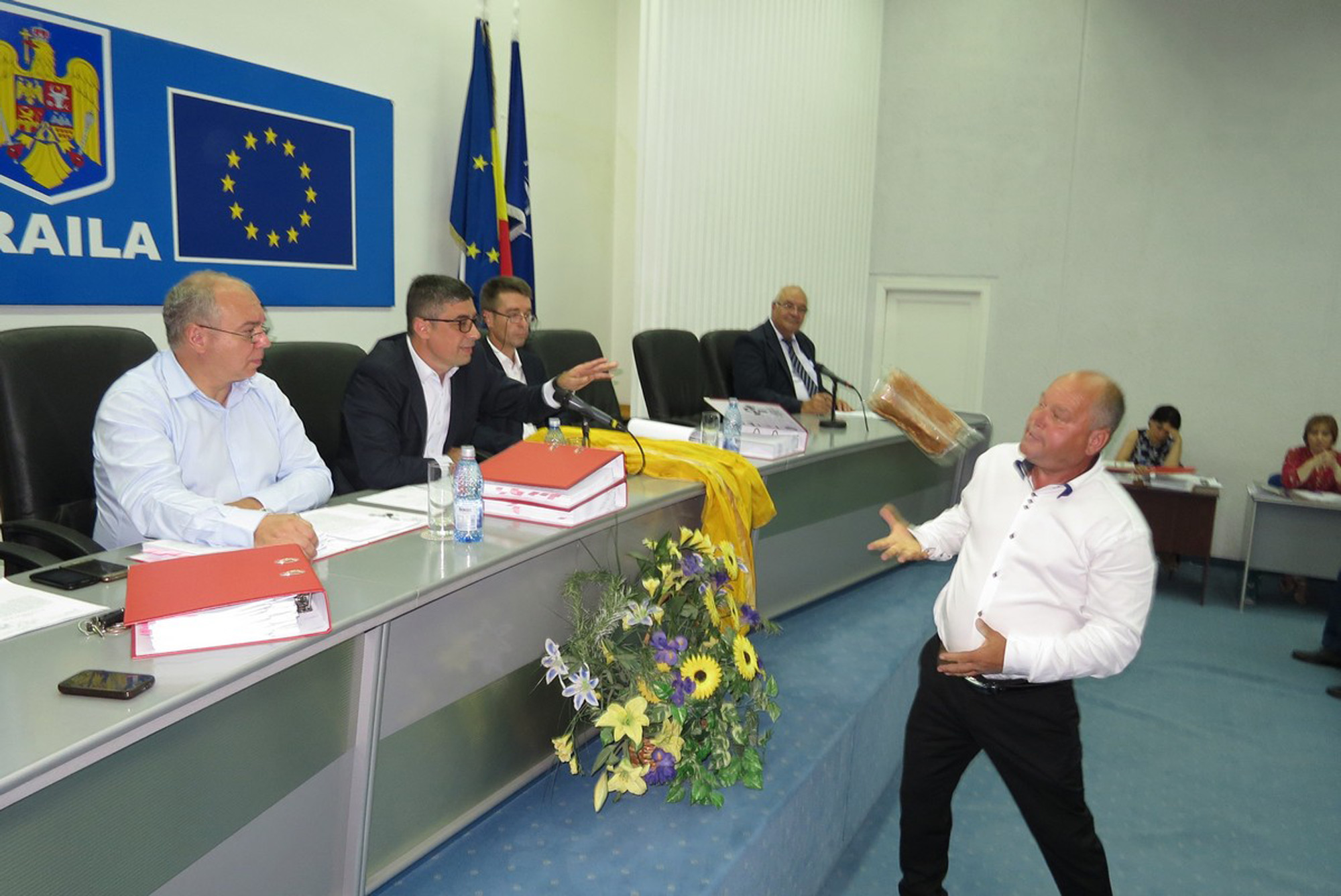 Moment agitat, ieri, la şedinţa ordinară a Consiliului Judeţean Brăila. Consilierul PNL Ovidiu Nechita a venit “înarmat” la şedinţă cu un cozonac şi o geacă galbenă zdrenţuită pe post de “cadouri” pentru preşedintele CJ, Francisk Chiriac, în semn de protest faţă de declaraţiile făcute de acesta în cadrul unei conferinţe de presă, după şedinţa din luna iunie.