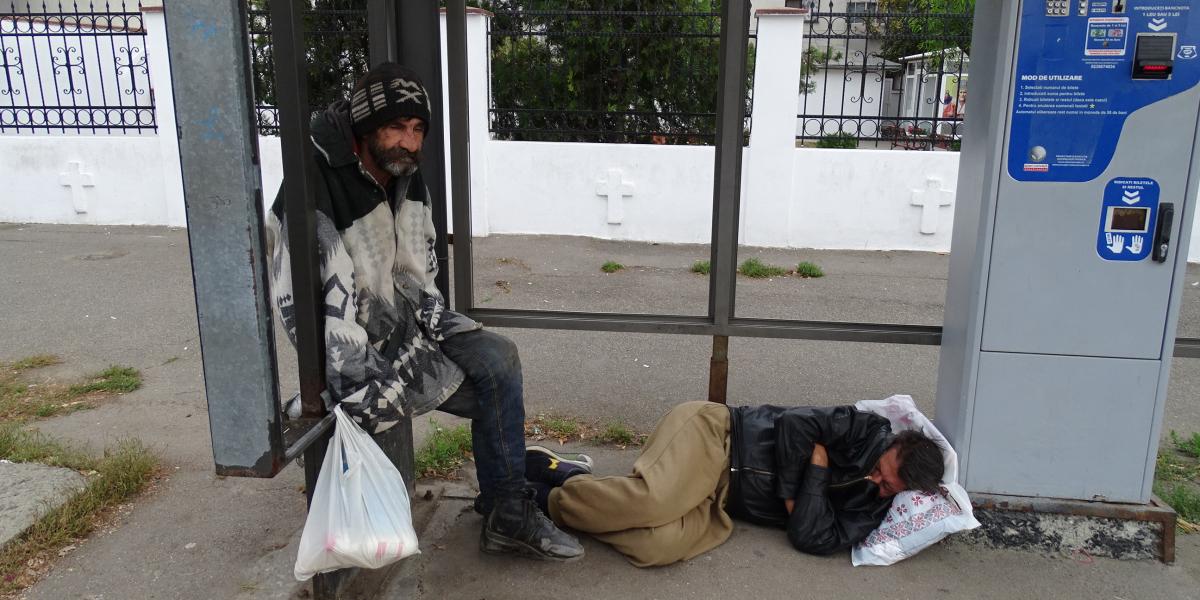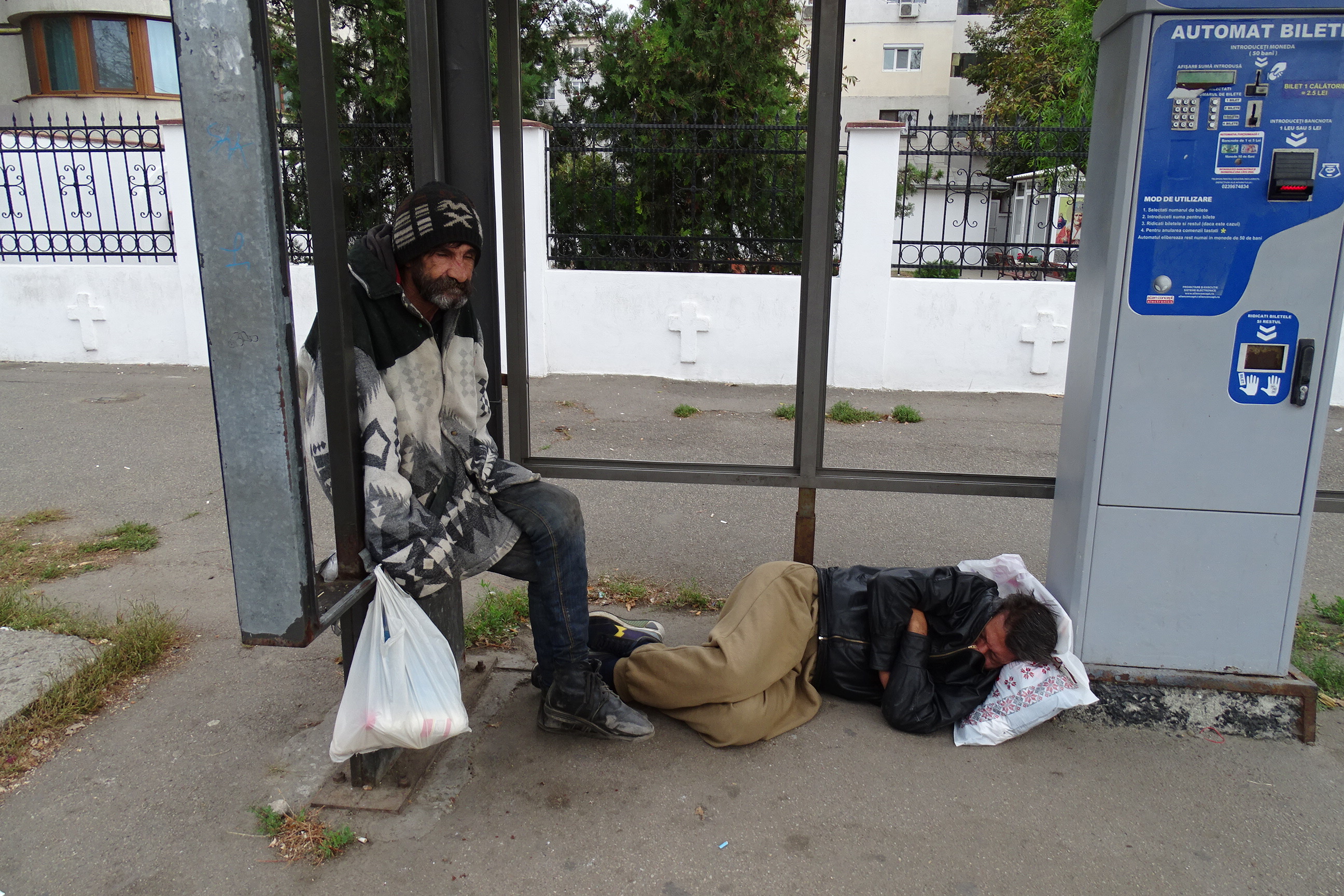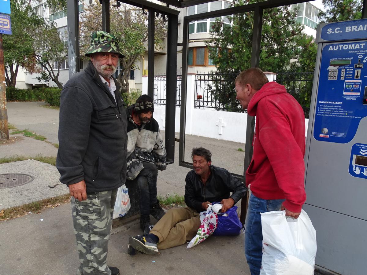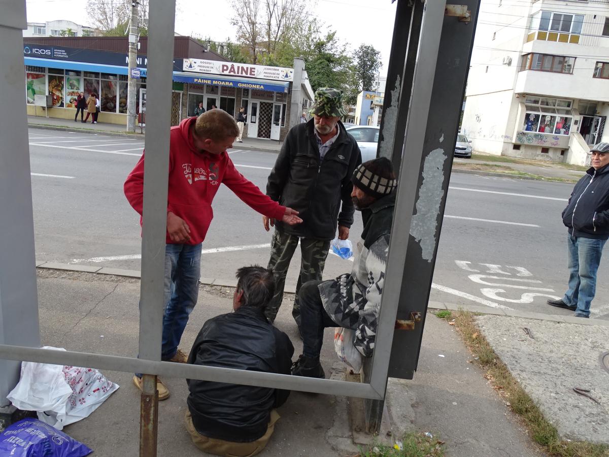 Oamenii străzii sunt ridicați de Poliția Locală, care fie îi îndepărtează din zonă, fie îi transportă la Unitatea de Primiri Urgențe, atunci când au probleme de sănătate din cauza consumului de alcool. La UPU fac scandal în timp ce sunt tratați de medici, apoi sunt din nou liberi, întorcându-se pe stradă, iar fenomenul se repetă la infinit. În ultima vreme, mulți dintre acești defavorizați ai sorții au luat în stăpânire anumite stații ale Braicar, făcându-și acolo culcuș, spre nemulțumirea călătorilor care se văd obligați să aștepte autobuzul în aer liber. Un astfel de exemplu, despre care relatam recent, este al unui om al străzii care s-a făcut stăpân pe o stație Braicar din Vidin. Zilele trecute, am asistat la o scenă similară la stația vandalizată și cu toate geamurile sparte, de lângă biserica din Radu Negru, unde călătorii stăteau la 3-4 metri distanță, din cauza mirosului insuportabil şi a faptului că doi amărâţi ai sorţii ocupaseră staţia de autobuz. Unul, treaz, ne spune că a lucrat la Navrom, iar despre “colegul” său (care dormea butuc), că este pensionar. Nu trece mult timp, iar un individ îmbrăcat într-un trening roşu şi care a trecut strada aiurea, împleticindu-se, l-a trezit cu câţiva pumni în cap, şuturi şi înjurături, pe cel culcat, obligându-l să părăsească zona. Nu trece mult timp şi apare un zdrahon în vârstă, cu o sacoşă, arătându-le conţinutul şi întrebându-i pe primii: “Bă, aţi scos ceva?” (probabil, bani) – fără a se sinchisi, ba chiar zâmbind, când l-am fotografiat. După care, cel buimac de somn, scutură din cap, îşi adună de pe jos încălţările, şi spune: “Hai să mergem, bă”. Unde, numai ei ştiau, doar cel de la Navrom rămânând în staţie, pentru la noapte…