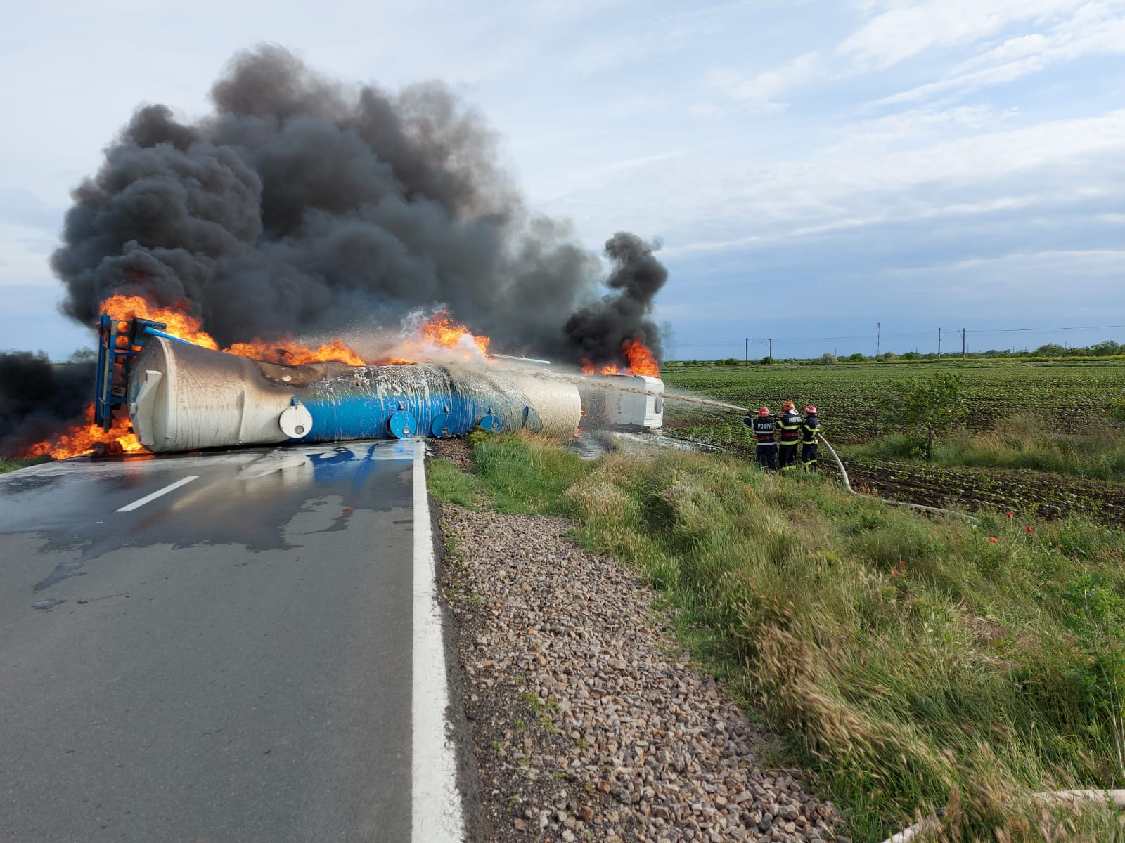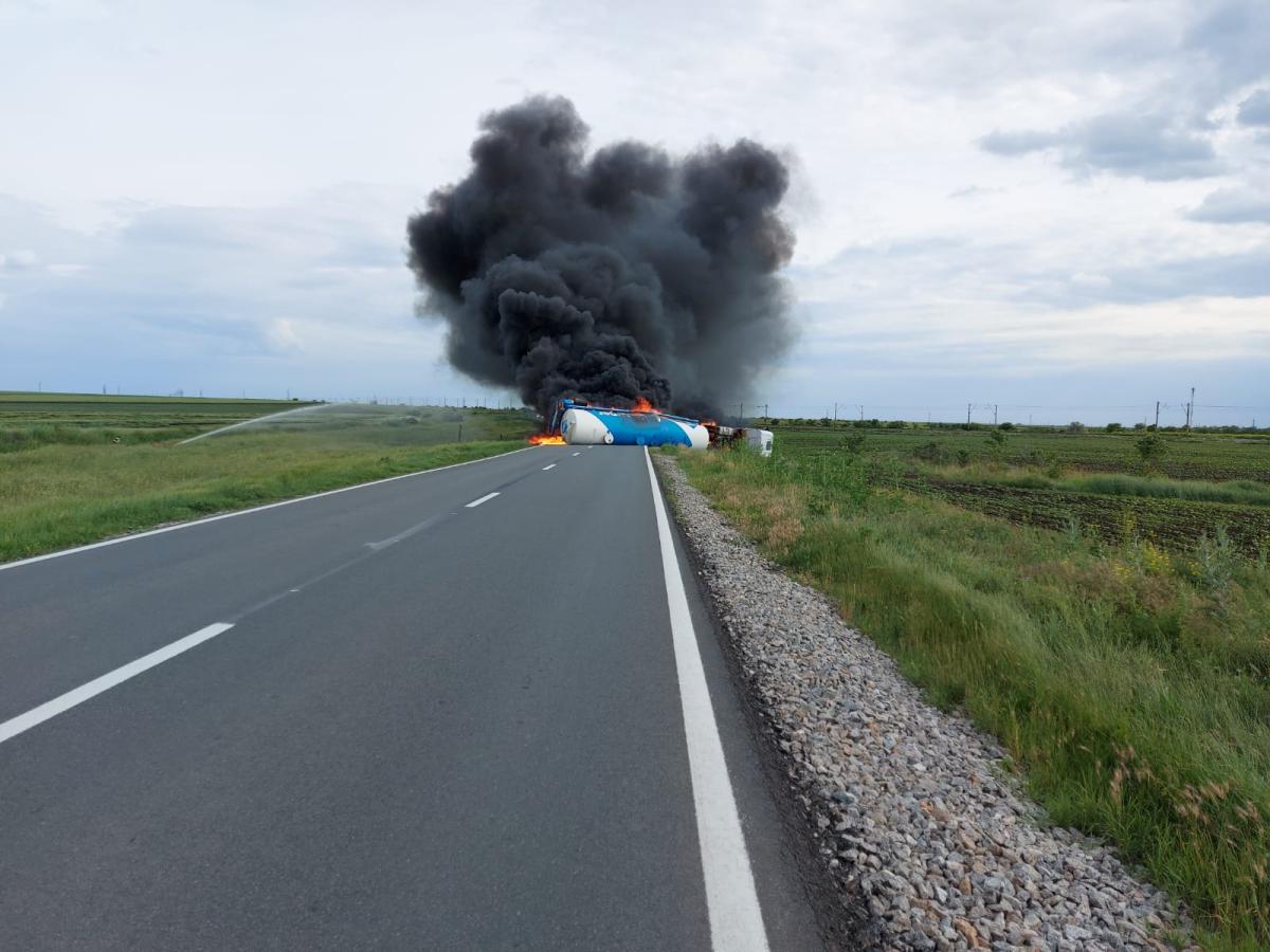 O cisternă încărcată cu motorină s-a răsturnat, în această seară, în jurul orei 17.00, și a luat foc, pe DN 21 Brăila - Slobozia, la ieșirea din localitatea brăileană Bărăganu, spre Țăndărei. Traficul în zonă a fost blocat pe ambele sensuri. Pentru stingerea incendiului au intervenit pompierii Gărzii de Intervenție Însurăței și Punctului de Lucru Dudești. Șoferul autocisternei, un cetățean moldovean în vârstă de 61 de ani, a primit îngrijiri medicale de la un echipaj SMURD dar nu a fost nevoie de transportarea sa la spital. În jurul orei 18.30, în timpul intervenției pompierilor, conținutul cisternei a explodat, dar din fericire nu au fost victime. La ora 19.23, incendiul a fost lichidat. Vom reveni