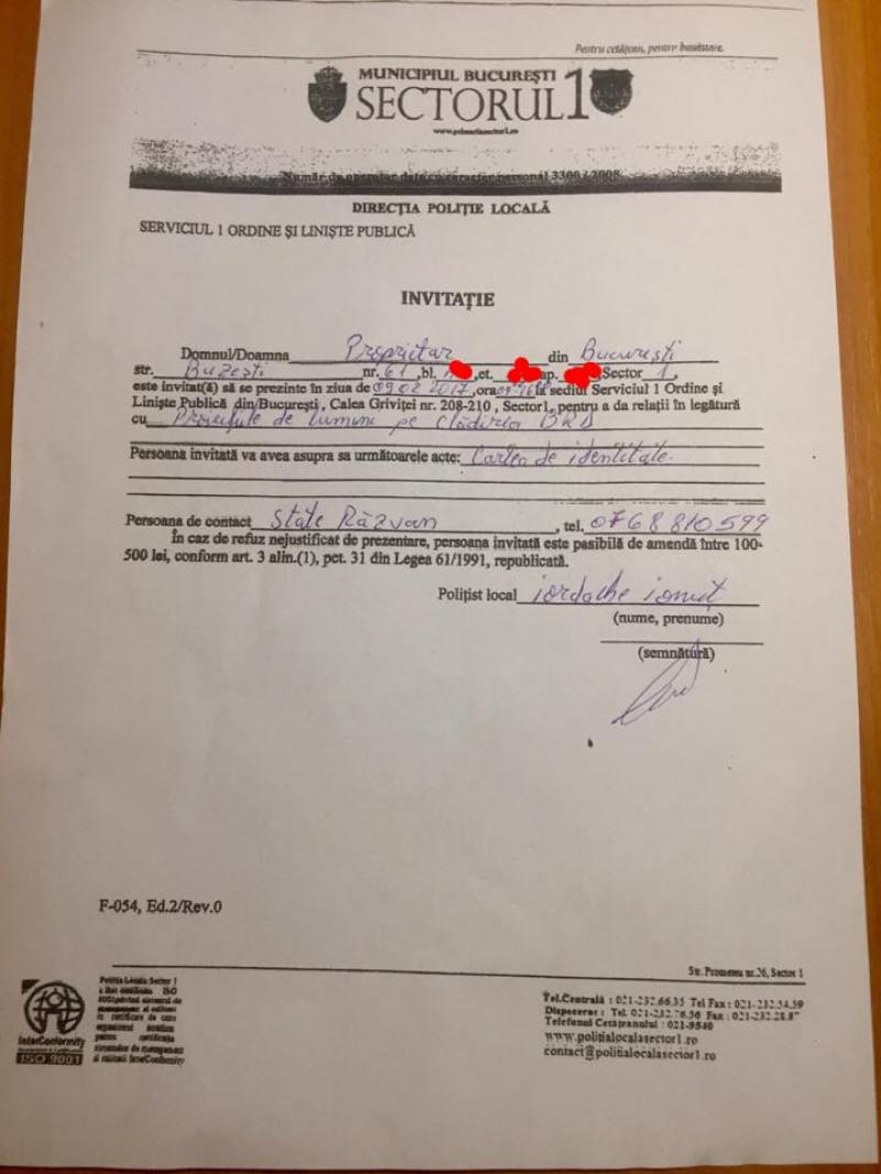 Pe documentul de la Poliția locală se precizează că neprezentarea la Serviciul 1 de Ordine și Liniște Publică se poate solda cu amendă între 100 și 500 de lei.