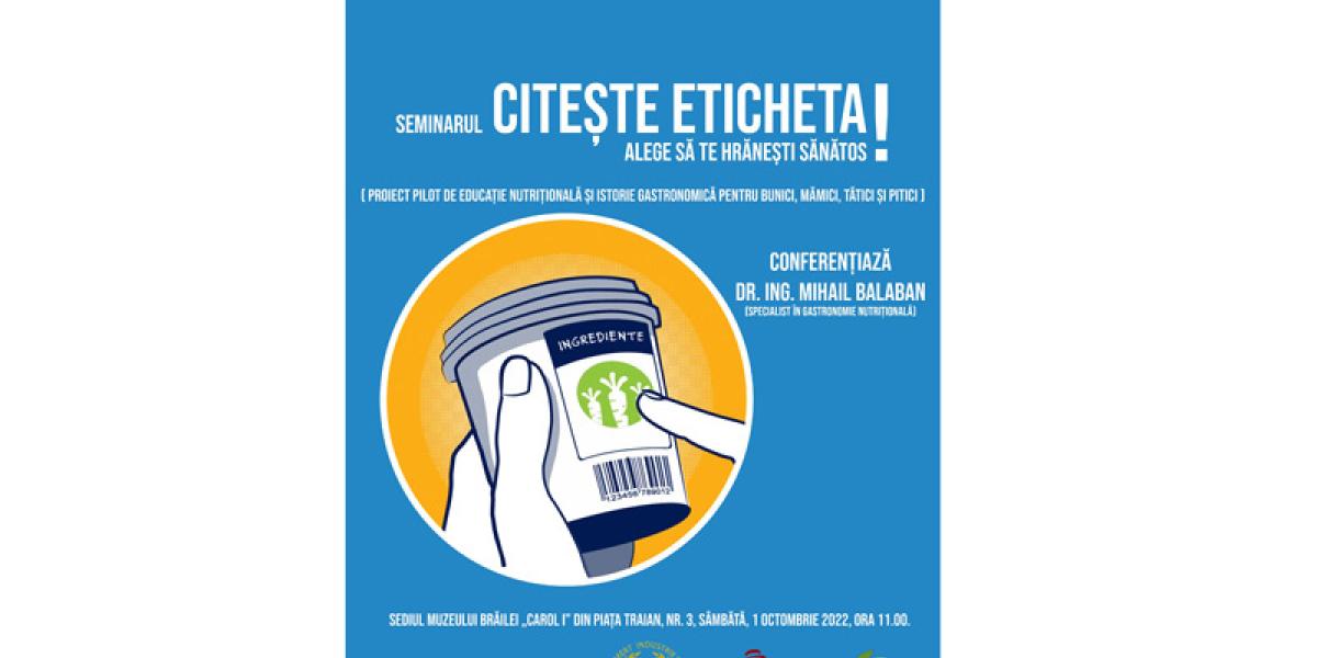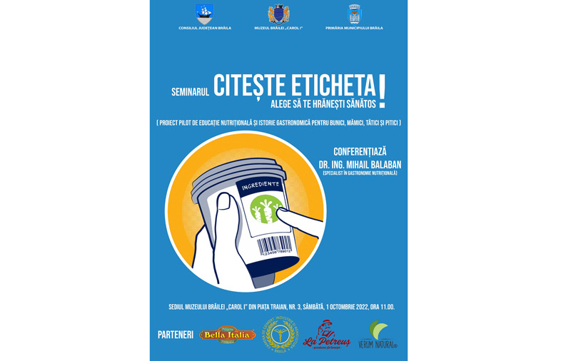 Muzeul Brăilei "Carol I", Consiliul Județean și Primăria Municipiului Brăila îi invită pe brăileni sâmbătă, 1 octombrie 2022, începând cu ora 11.00 (la sediul centrul din Piața Traian nr. 3) la seminarul cu tema "Citește eticheta! Alege să te hrănești sănătos!", organizat în colaborare cu specialistul în gastronomie nutrițională dr. ing. Mihail Balaban.