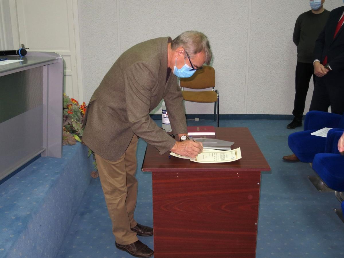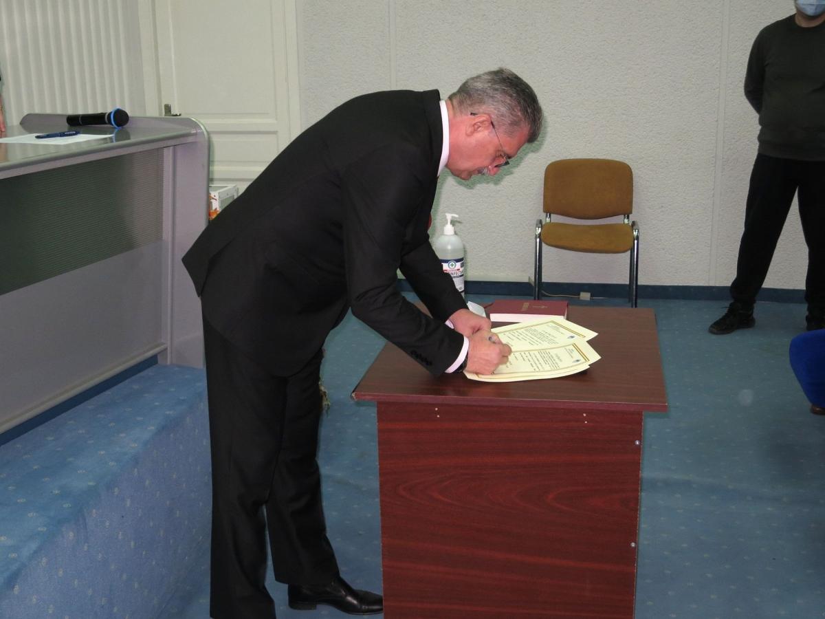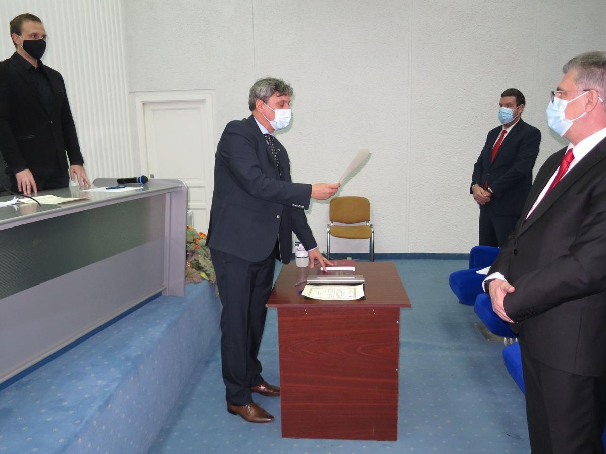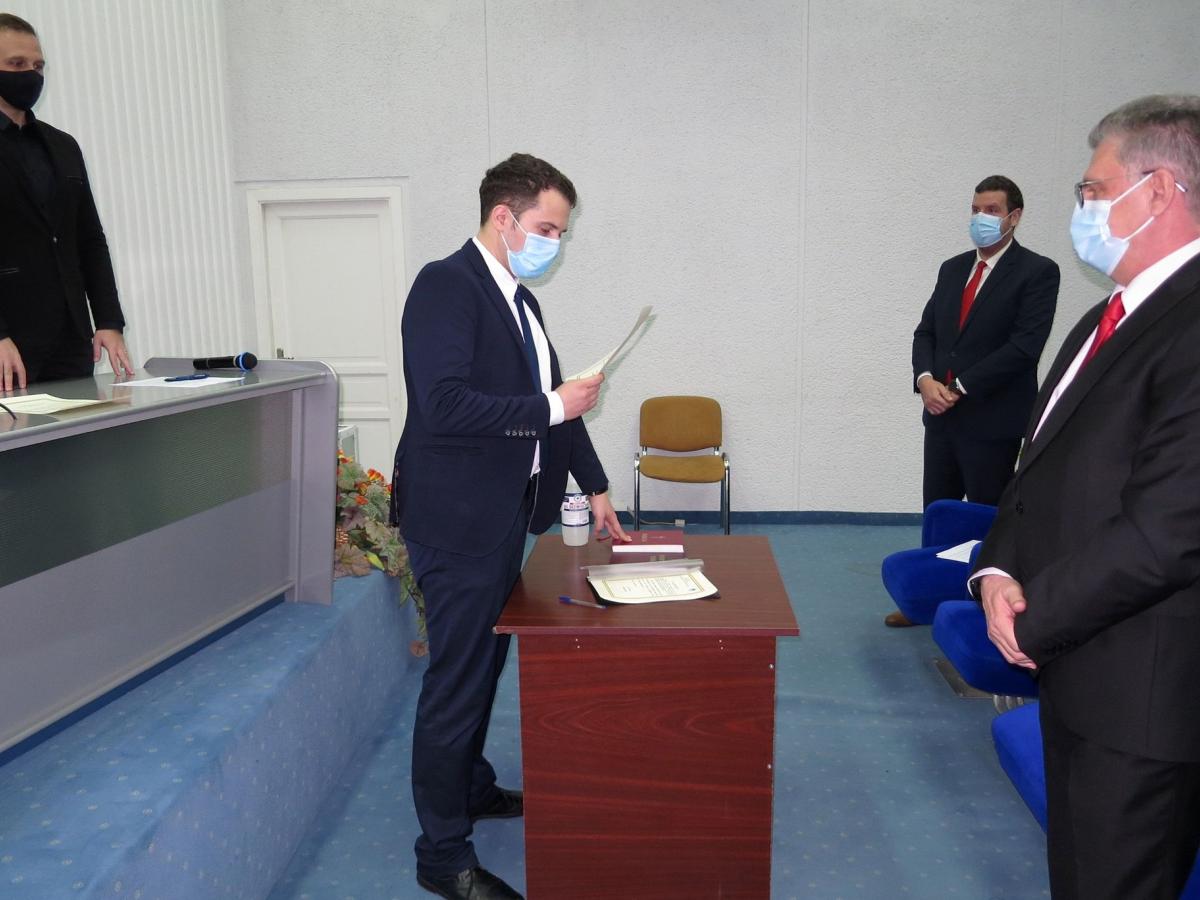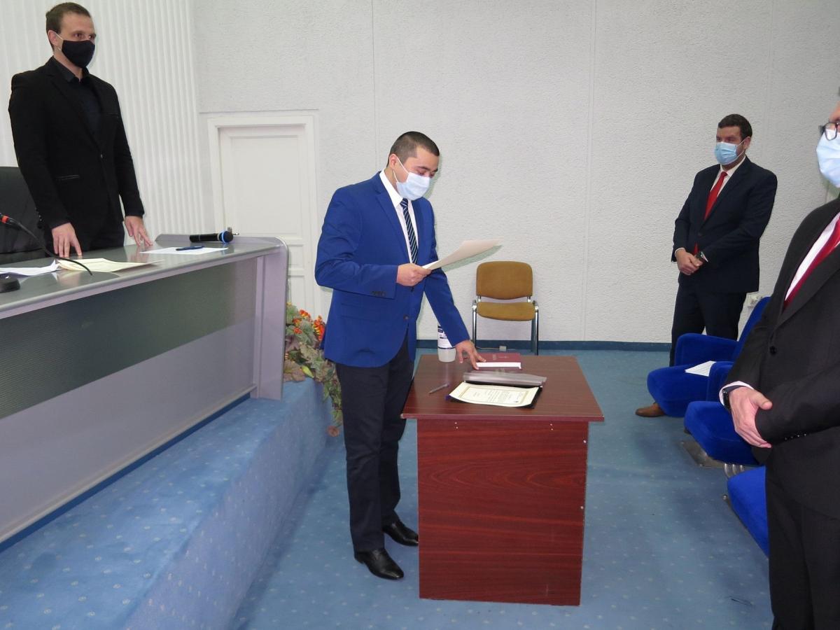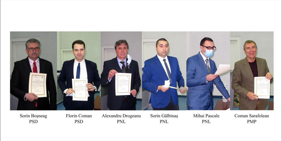 De altfel, primul proiect de pe ordinea de zi a ședinței extraordinare a fost legat de încetarea de drept a mandatului de consilier al lui Tabarac și declararea vacantă a locului său din Consiliu, proiect aprobat în unanimitate. Apoi a urmat depunerea jurământului de către noii consilieri, după ce secretarul general al municipiului, Ion Drăgan a dat citire a hotărârilor judecătorești prin care le-au fost validate mandatele. Aceștia au depus jurământul în ordinea alfabetică, astfel că primul a fost PSD-istul Sorin Eugen Boșneag (președintele organizației municipale a partidului), al cărui mandat fusese validat de la bun început, însă,din motive de sănătate, acesta nu și l-a putut lua în primire până acum. După preluarea mandatului, Boșneag a mers până la prezidiu pentru a da mâna cu primarul Marian Dragomir, gest pe care l-au repetat și o parte dintre ceilalți consilieri nou intrați în ”hora administrativă”. A urmat apoi PSD-istul Florin Coman (economist, funcționar bancar), apoi liberalii Alexandru Drogeanu (pensionar, instructor auto), Sorin Gălbinaș (tehnician veterinar, antreprenor), Mihai Viorel Pascale (geograf, profesor) și PMP-istul Coman Sarafolean (profesor, pensionar).