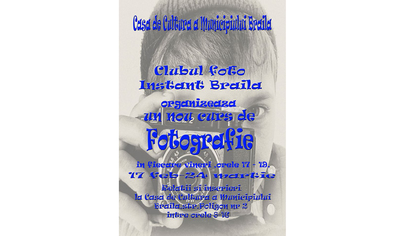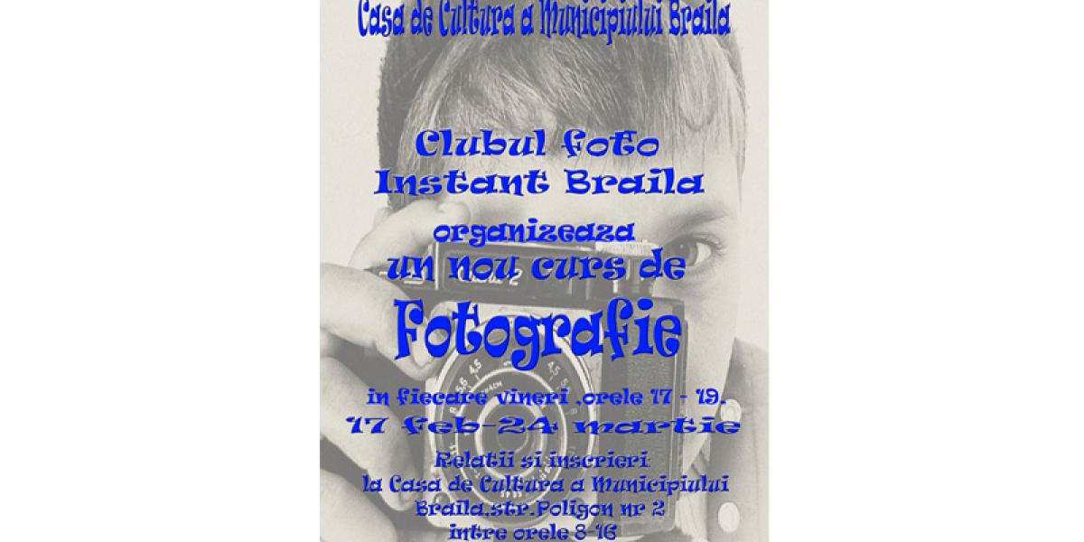 Casa de Cultură a Municipiului Brăila şi Clubul „Foto Instant” Brăila organizează, în perioada 17 februarie - 24 martie 2017, un curs gratuit de fotografie pentru începători, în fiecare vineri, între orele 17.00 -19.00. Cursul se adresează persoanelor cu vârsta de minimum 12 ani, care posedă aparat de fotografiat necesar pentru aplicaţiile practice, înscrierile urmând să se facă la sediul Casei de Cultură a Municipiului Brăila, din Casa Memorială “Petre Ştefănescu-Goangă”, Piaţa Poligon nr.2.