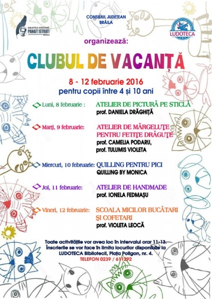 Vacanţa intersemestrială este prilej de distracţie, socializare, joacă şi învăţare la Biblioteca Judeţeană "Panait Istrati" Brăila. Copiii cu vârste cuprinse între 4 şi 10 ani sunt aşteptaţi să se înscrie în Clubul de vacanţă, care se va desfăşura în perioada 8 -12 februarie la Secţia de Copii. Ludotecă, iar activităţile vor avea loc zilnic, între orele 11.00 - 13.00, după următorul program: