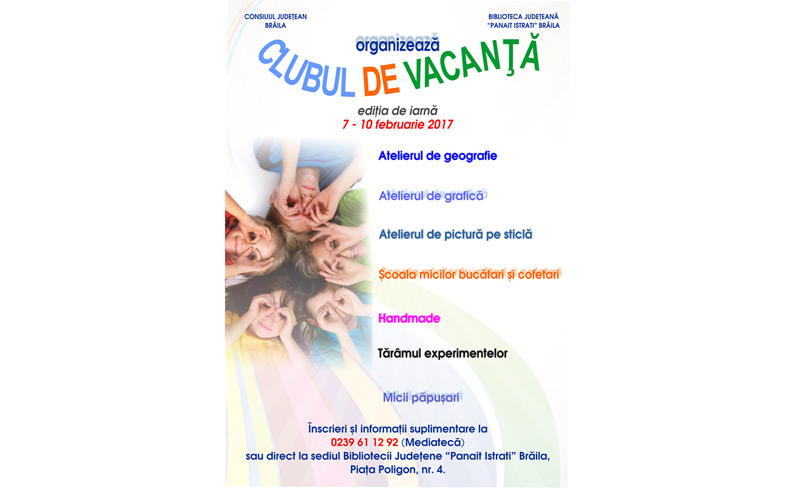 Biblioteca Judeţeană „Panait Istrati” Brăila organizează în perioada 7 - 10 februarie Clubul de vacanţă, ediţia de iarnă. Vacanţa intersemestrială este prilej de socializare, joacă şi învăţare pentru copii, motiv pentru care aceştia sunt aşteptaţi să se înscrie la Atelierele de geografie, handmade, pictură pe sticlă, Micii Păpuşari, Şcoala micilor bucătari şi cofetari, Tărâmul experimentelor, grafică. De precizat este faptul că, toţi copiii care doresc să participe la Clubul de vacanţă trebuie să posede permis de intrare la Bibliotecă.