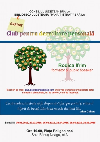 Biblioteca Judeţeană „Panait Istrati" Brăila organizează în perioada ianuarie - iunie 2016 Clubul de dezvoltare personală susţinut de Rodica Ifrim, formator şi public speacker. Cursurile sunt gratuite şi se adresează oamenilor care caută constant să-şi depăşească limitele sau care îşi pun întrebări despre cum pot fi mai productivi, cum îşi pot seta mai bine obiectivele şi cum îşi pot păstra motivaţia pentru a reuşi.