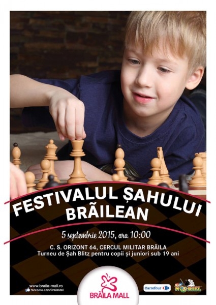 Sâmbătă, 5 septembrie, clubul "Orizont 64" în colaborare cu Direcţia Judeţeană pentru Sport şi Tineret Brăila şi Cercul Militar organizează cea de a XV-a ediţie a "Festivalul şahului brăilean", o competiţie de şah blitz, rezervată copiilor şi juniorilor cu vârste până în 19 ani. Turneul care se va desfăşura la Mall şi va fi structurat pe trei secţiuni, 5-9 ani, 10-13 ani şi 14-19 ani. Se vor aplica regulamentele Federaţiei Române de Şah şi FIDE. Înscrierile pentru această competiţie sunt limitate la 50 de participanţi. Ritmul de joc: fiecare jucător va dispune de 5 minute pentru toată partida. Criteriile de departajare, în caz de egalitate, vor fi anunţate de organizatori în ultima rundă. În funcţie de numărul de participanţi din fiecare turneu se va juca în sistem eliminatoriu sau sistem round-robin fiecare cu fiecare. Competiţia se va desfăşura la Mall Braila, începând cu ora 9.30. Înscrierile încep la ora 9.00. Informaţii suplimentare se pot afla de la Ionel Balcan, vicepreşedintele clubului "Orizont 64", la numerele de telefon, 0721 894024 şi 0746 251342 sau pe adresa de email - orizont64@yahoo.com. Premierea va avea loc în aceeaşi zi, după încheierea ultimei runde. Arbitrii competiţiei sunt Mircea Camburi şi Ionel Balcan.