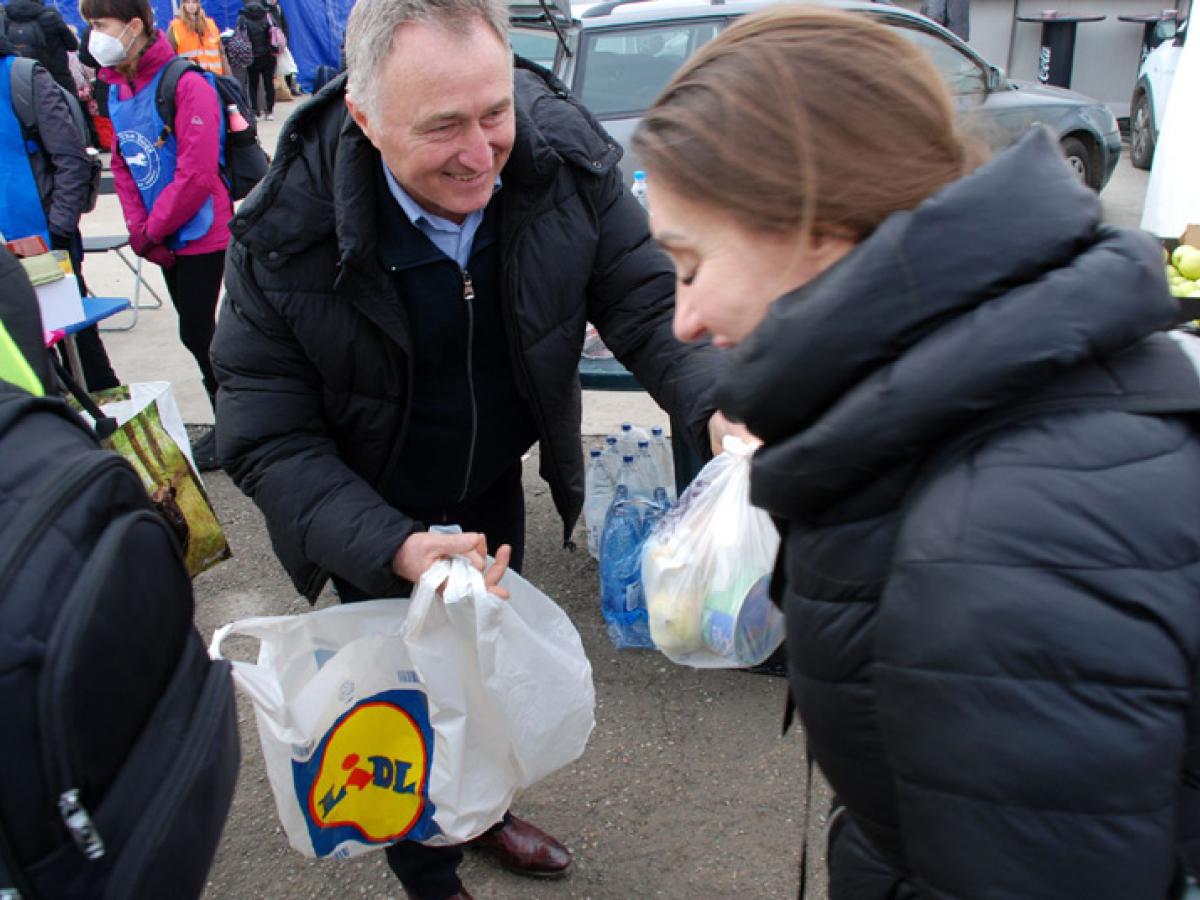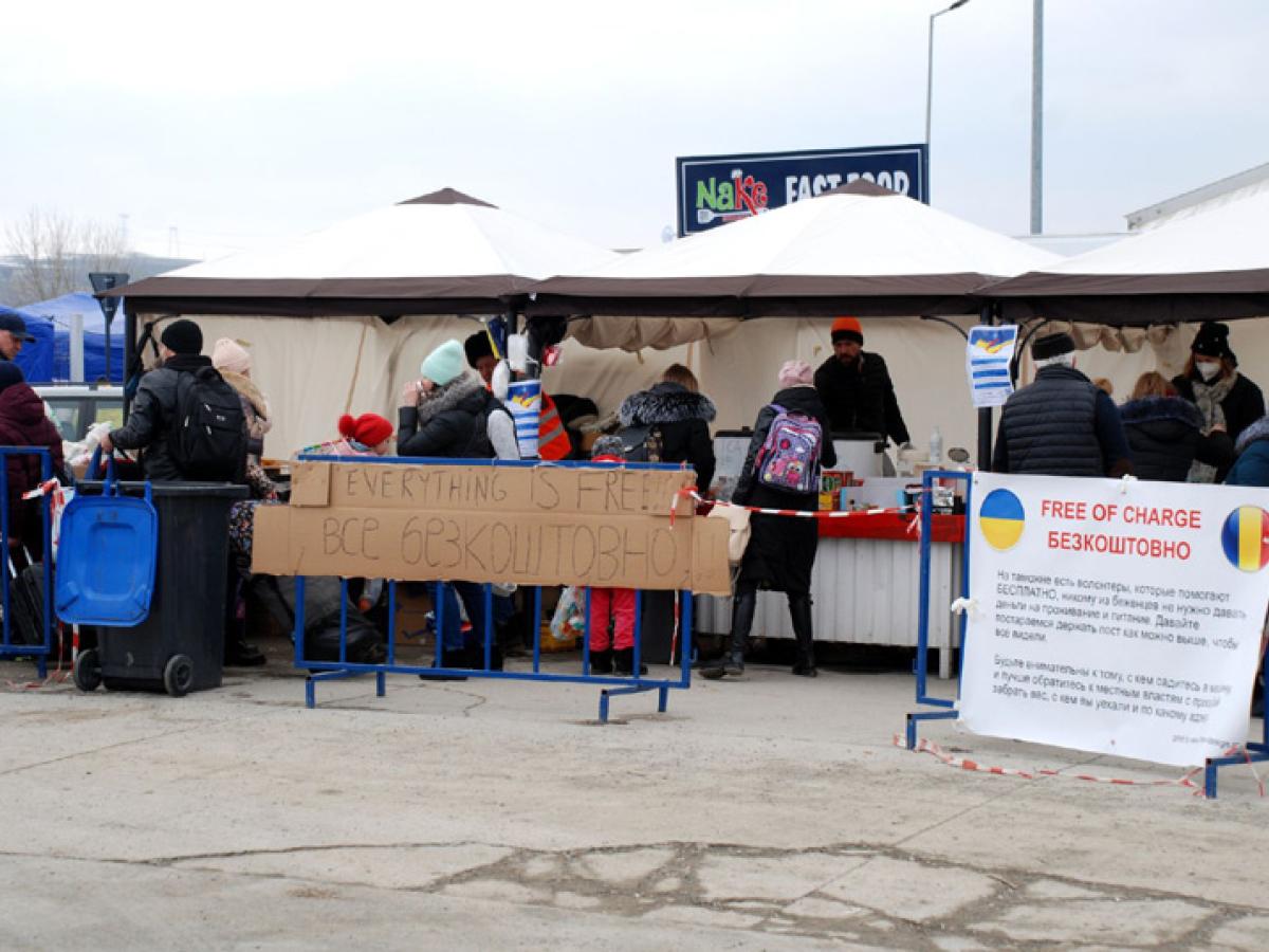 Și înainte, și după ce trec de punctul de vamă, refugiații sunt întâmpinați la Isaccea de voluntari care le oferă alimente, produse de igienă, haine sau pături. Cantități impresionante de donații au venit din toată țara de la români dornici să își ajute vecinii loviți de această nenorocire. Au fost amenajate standuri de unde refugiații se pot servi, gratis, cu tot ceea ce consideră că au nevoie. N-am văzut pe niciunul să ia mai mult decât îi trebuie. Cu mult bun-simț, oamenii se apropie și aleg câte un pachet - două de biscuiți, o banană, un măr, o pastă de dinți sau alte asemenea produse. Lângă o masă încărcată cu de toate, un bărbat cu accent moldovenesc și cu privire blajină, îi atingea încet pe umăr, oferindu-le un pachet cu alimente. ”Cuciș, cuciș!”, îi îmbia omul pe toți refugiații care treceau pe lângă el. Îl cheamă Marcel Sluser și venise, vineri, împreună cu niște prieteni, de la Vaslui. ”Ne-am unit mai mulți, am cumpărat alimente, haine și pături și ne-am hotărât să venim aici, la Isaccea, pentru că ieri am văzut la televizor că e frig și ninge. Puteam merge la Iași, la vama cu Republica Moldova, dar am zis că aici e vreme mai rea și e mai multă nevoie de păturile pe care le puteam oferi. Ne-am instalat la măsuța asta și oferim ce am adus tuturor celor care au nevoie”, ne-a spus vasluianul. L-am întrebat ce înseamnă „cuciș”, cuvântul pe care îl repetă continuu când oferă pachetele. „Nici nu știu, i-am auzit și eu pe alții că spun așa și m-am luat după ei. Sper că e ceva de bine!”, ne-a răspuns el zâmbind. Ne-a mai spus că acasă are posibilitatea să cazeze, pentru o săptămână - două, trei sau patru persoane. ”Ne-am înscris pe listă aici, la ISU, ca să ne repartizeze pe cineva, să-i luăm cu noi când ne întoarcem la Vaslui!”.