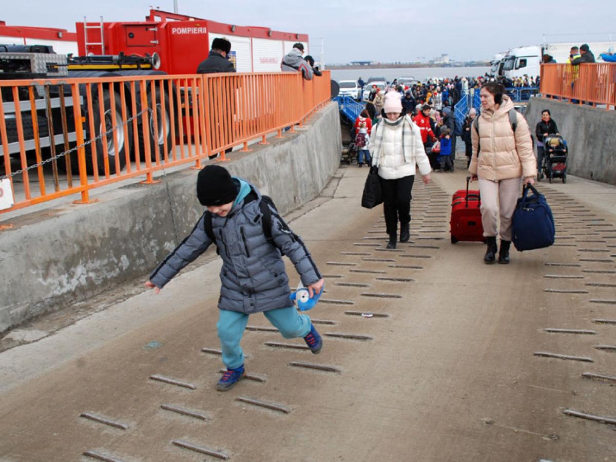 Când bacul acostează pe malul românesc, un val de oameni se revarsă de pe puntea încărcată cu autoturisme și TIR-uri. Refugiații ocupă fiecare centimetru pătrat rămas liber, iar când rampa se coboară, pornesc spre mal într-o coloană care pare că nu se mai sfârșește. Nu e, totuși, deloc dezordine în această îmbulzeală. Vineri, 4 martie, la bacul ajuns în vamă în jurul orei 11.00, câțiva jandarmi așteptau la rampă, pentru a-i ajuta pe cei cu bagaje prea multe sau pe bătrânii greu deplasabili. Și voluntari ai Crucii Roșii erau gata oricând să dea o mână de ajutor.