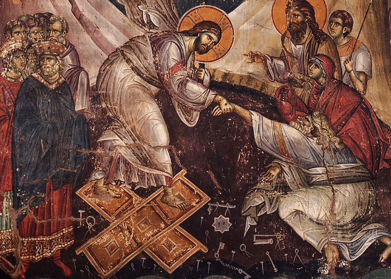 Hristos coboară până la temelia zidirii, dar nu ca osândit, ci în chip de Dumnezeu, care vine să aducă lumina în zonele cele mai întunecate ale creaţiei.