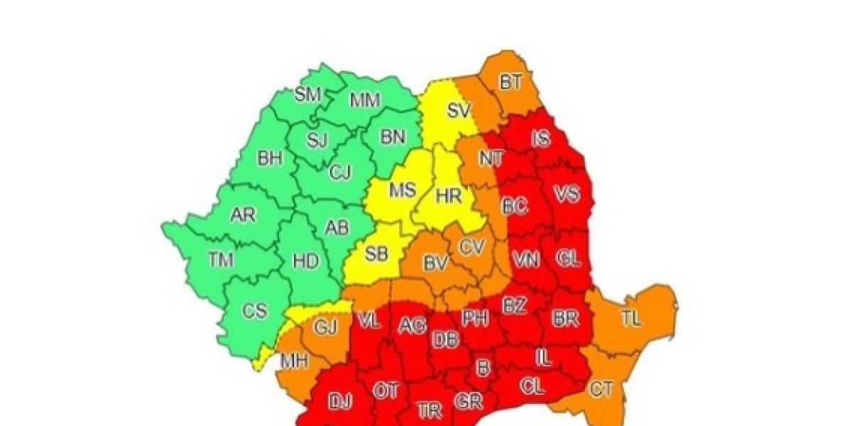 Meteorologii au emis, astăzi, o avertizare cod roşu de caniculă, valabilă sâmbătă pentru 19 judeţe şi pentru municipiul Bucureşti. Temperaturile pot urca până la 44 de grade Celsius, iar celelalte judeţe ale ţării se vor afla sub cod portocaliu sau galben.