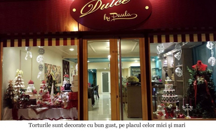 Prăjiturile de casă, decorate ingenios, torturi cu decoraţiuni în spiritul Crăciunului, cu frişcă multă sau cu marţipan, îmbie pe toată lumea care trece pragul elegantei cofetării. Surprinzătoare şi atrăgătoare sunt şi torturile decorate cu vată de zahăr sau cu diferite figurine, flori, toate lucrate manual, din zahăr. Gustul extraordinar de bun este dat nu numai de reţetele de casă folosite în cofetărie, exersate ani de zile, până când au ajuns la perfecţiunea gustului şi formei, ci şi de ingredientele proaspete şi naturale care garantează calitatea produselor de la cofetăria "Dulce by Paula".