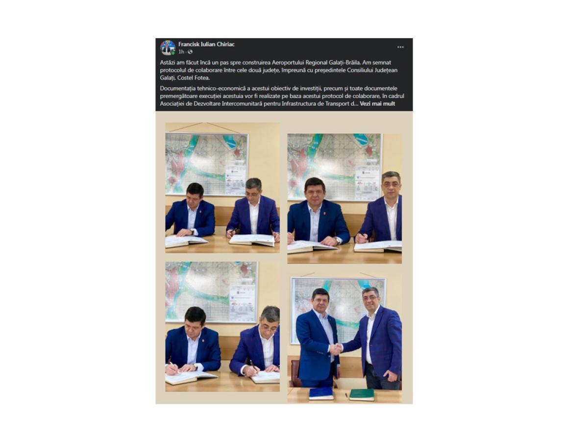 * președintele CJ Brăila, Francisk Iulian Chiriac și omologul său de la Galați, Costel Fotea, au semnat protocolul de colaborare pentru construirea Aeroportului Regional de la Braniștea * după semnarea documentului, ambii șefi ai celor două consilii județene au postat comunicate pe rețelele de socializare, vorbind despre planurile comune de viitor