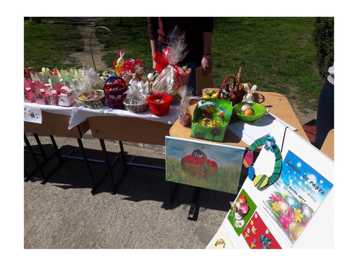 Pentru aceasta s-au realizat ornamente/decoraţiuni cu tematică pascală, felicitări realizate în diverse tehnici, tablouri, icoane ş.a. Pentru târg s-au realizat şi produse culinare - prăjituri făcute de elevi ai liceului nostru împreună cu părinţii lor (clasele primare).