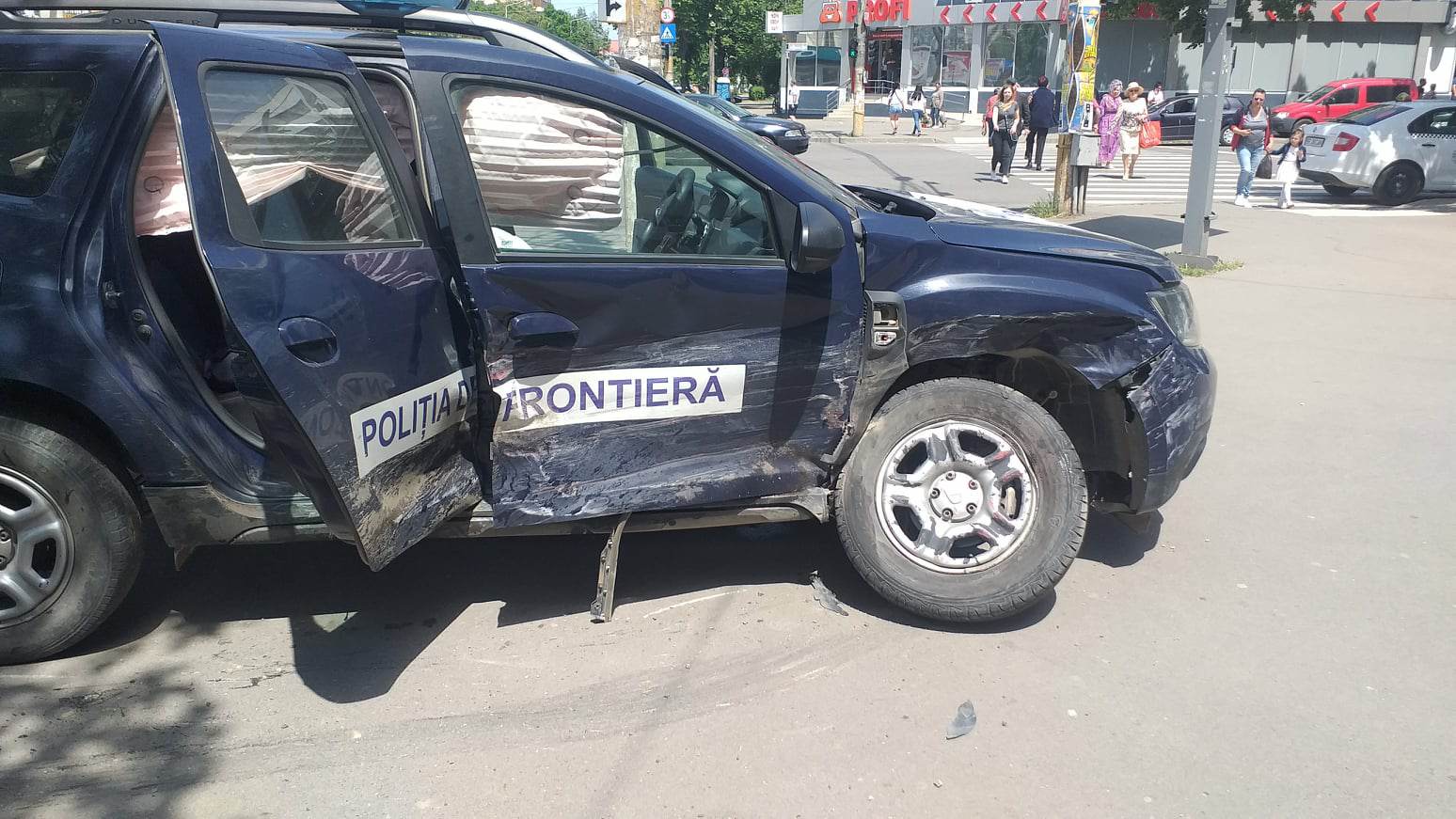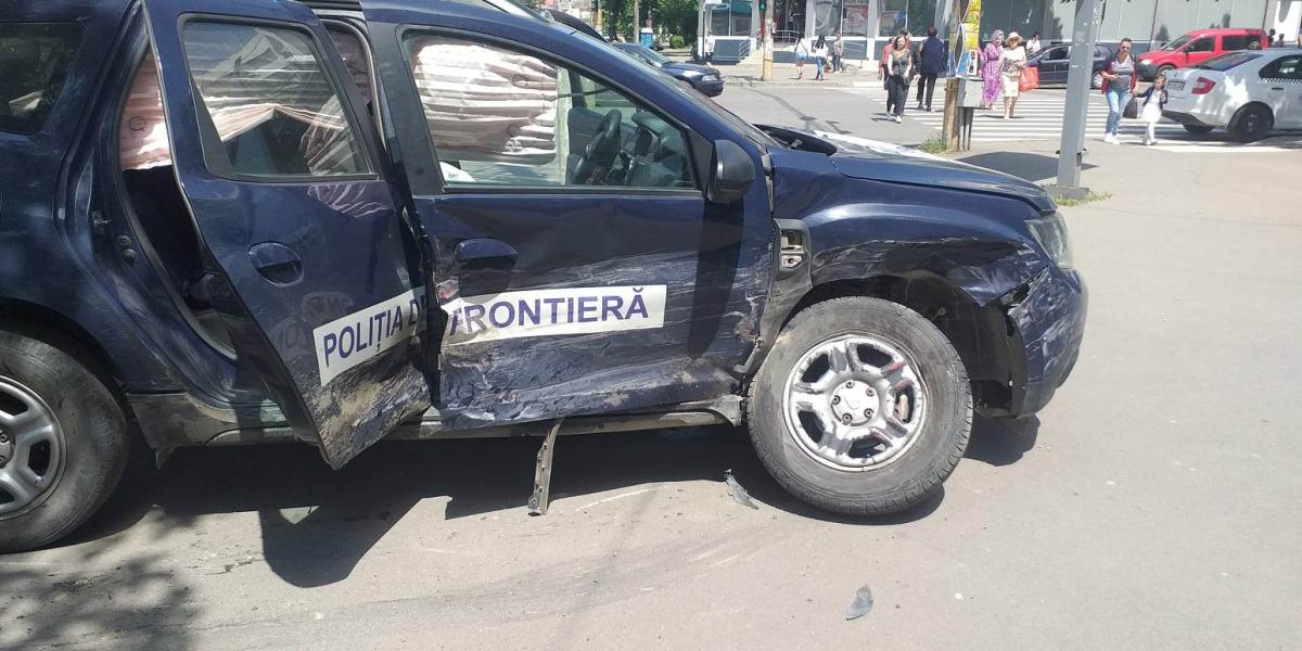 Impact violent între o maşină a Poliţiei de Frontieră, aflată în misiune, şi un autoturism condus de o femeie care, cel mai probabil, nu a auzit semnalele acustice şi nu a reuşit să oprească la timp, pentru a evita impactul. Nu au rezultat victime, dar maşina de poliție a ajuns pe marcajul pietonal, însă nu era vreo persoană în zonă.