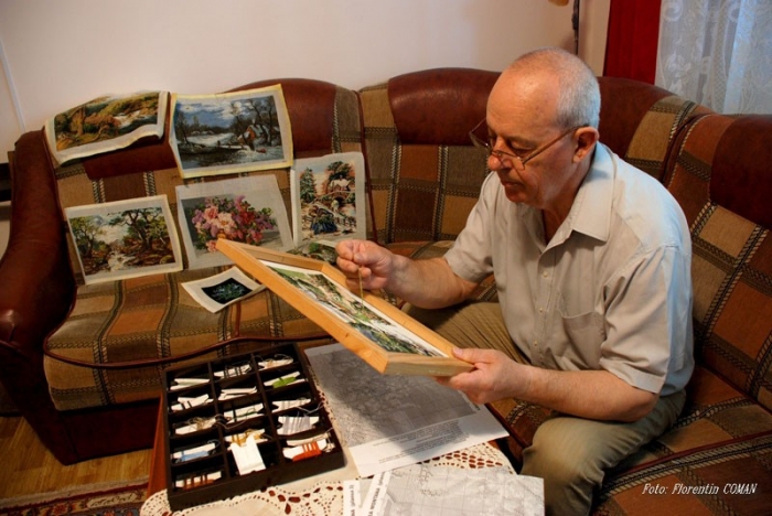 "Mi-a plăcut de mic copil să meşteresc şi să şurubăresc, dar nu mi-aş fi imaginat cât de mult te poate acapara acest hobby, al realizării de goblenuri. Într-o zi, eram acasă cu un nepoţel care a deschis, jucându-se, un sertar unde se afla un goblen realizat doar pe jumătate. Îl făcuse fiică-mea, în timpul studenţiei. Nu aveam habar cum se face treaba asta, dar m-am gândit că ar fi interesant dacă aş termina eu ceea ce începuse ea. Am lucrat fără să spun nimănui din familie, că voiam să fie surpriză. A durat ceva vreme până l-am terminat, fiindcă lucram foarte încet. În opt ore abia dacă făceam un centimetru pătrat, cu lupa de ceasornicar la ochi. Dar cu atât mai mare a fost satisfacţia când l-am văzut finalizat... Mai ales că fiică-mea şi nevastă-mea m-au felicitat pentru felul cum am reuşit să respect schema şi să combin culorile. Din acel moment a început «nebunia». Lucram toată ziua şi mă trezeam chiar şi noaptea, ca să fac un centimetru cu o anume nuanţă de culoare. Nici nu mai puteam să dorm gândindu-mă la desenul pe care trebuia să îl realizez din fire colorate", ne-a povestit Ioan Popovici.