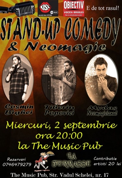 Amatorii de stand up comedy şi spectacole de magie se vor putea delecta, astăzi, cu un show intitulat Comedy Night la The Music Pub. Mai exact, în această seară, începând cu ora 20:00, terasa situată pe Strada Vadul Schelei, nr. 17, va găzdui trei artişti: Tiberiu Popovici - (stand up comedy), Cosmin Bighei (stand up comedy) şi Mydas, primul neomagician din România. Preţul unui bilet este 20 lei, iar cei interesaţi pot face rezervări la numărul de telefon - 0746/479.279. Tiberiu Popovici este unul din cei mai prolifici comedianţi români. A debutat, în 2005, în Cafe Deko, clubul de origine al stand-up comedy-ului românesc, în cadrul serilor de open-mic. În scurtă vreme, a ajuns să prezinte seara de open-mic şi să deschidă spectacolele celor de la Trupa Deko. Apoi, a fondat Trupa Cealaltă, cu care a susţinut spectacole timp de doi ani pornind din cluburi şi baruri de dimensiuni reduse (50-100 de persoane) pentru a ajunge la spectacole mari (500-1.000 de persoane) atât în Bucureşti, cât şi în ţară. În paralel cu activitatea trupei, Tiberiu a dezvoltat o cariera solo ca M.C. şi comediant. De asemenea, acesta a făcut parte din majoritatea proiectelor stand-up comedy de anvergură din România - Retrospectiva Cafe Deko, Fresh-Up la un Stand-Up, Stand-Up In The City, Noaptea Devoratorilor de Stand-Up etc. După primul turneu solo - Umor Ofensiv - a urmat Cool Summer Artitude, un concept inedit de spectacol care a îmbinat în egală măsură street-dance, stand-up comedy şi hip-hop. În cadrul turneului, Tiberiu Popovici a colaborat cu Trouble Crew, Agresiv, DJ Swamp (B.U.G. Mafia), Maximilian şi Grasu XXL.
