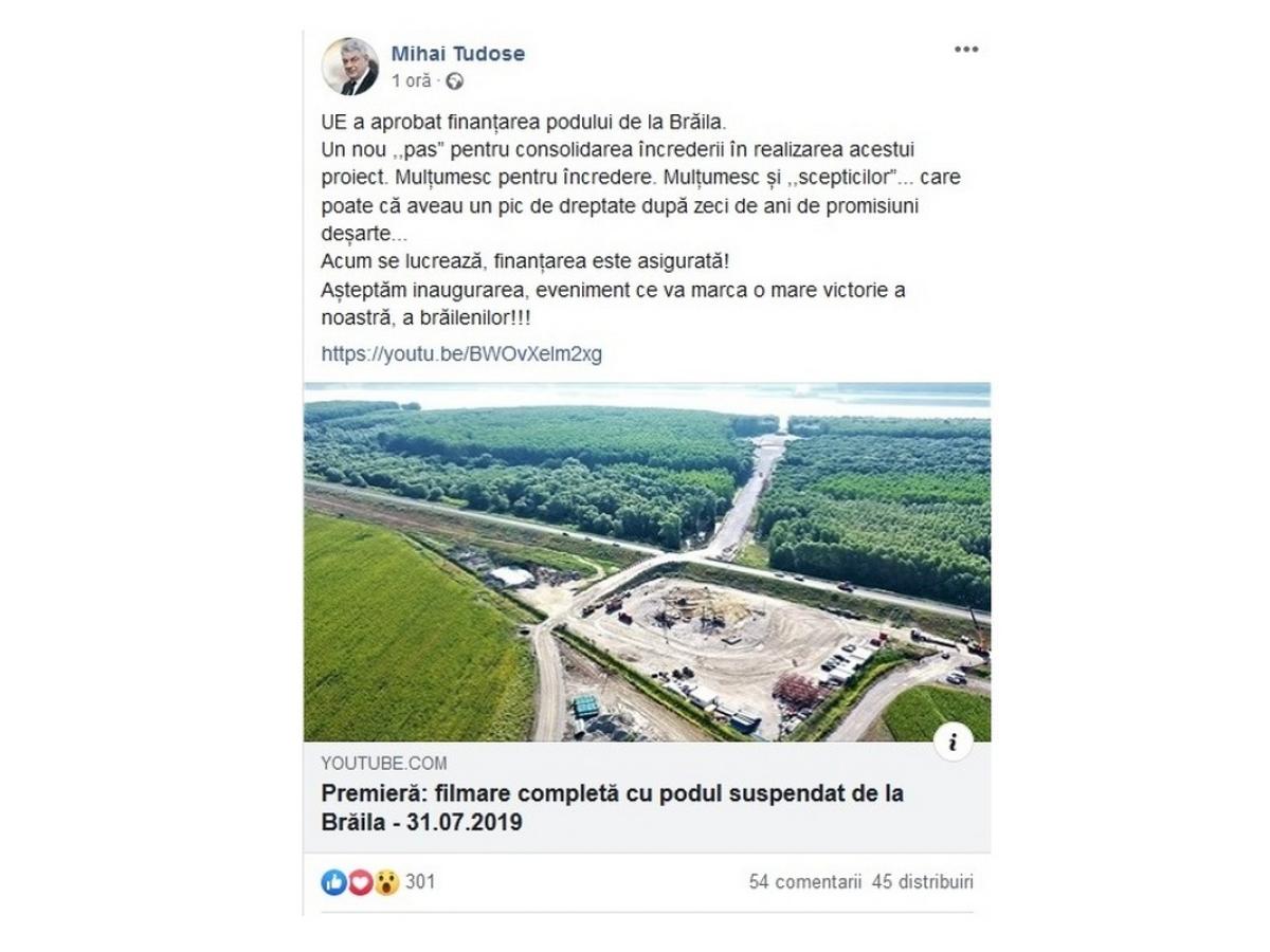 ”UE a aprobat finanțarea podului de la Brăila. Un nou «pas» pentru consolidarea încrederii în realizarea acestui proiect. Mulțumesc pentru încredere. Mulțumesc și «scepticilor»... care poate că aveau un pic de dreptate după zeci de ani de promisiuni deșarte... Acum se lucrează, finanțarea este asigurată! Așteptăm inaugurarea, eveniment ce va marca o mare victorie a noastră, a brăilenilor!”, a postat Tudose pe pagina sa personală de Facebook.