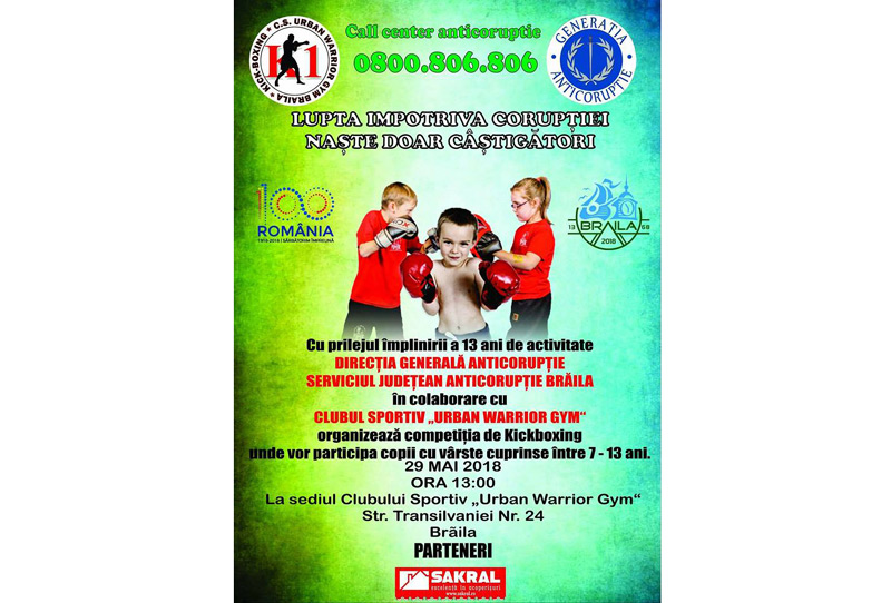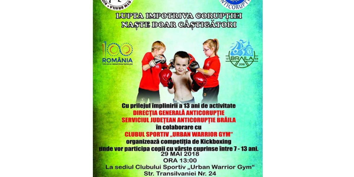 Cu prilejul împlinirii a 13 ani de activitate, Direcţia Generală Anticorupţie - Serviciul Judeţean Anticorupţie Brăila, în colaborare cu clubul sportiv “Urban Warrior Gym” Brăila a organizat o competiţie de Kickboxing. Au participat sportivi de la club şi sportivi de la K1 Galaţi, cu vârste cuprinse între 7 şi 13 ani. Mesajul transmis cu ocazia competiţiei a fost unul interesant: “Lupta împotriva corupţiei naşte doar câştigători!”.