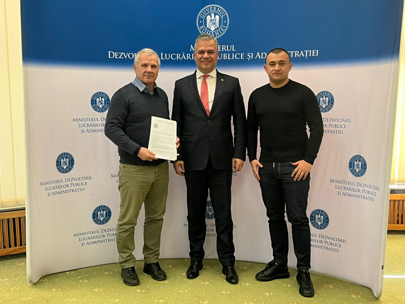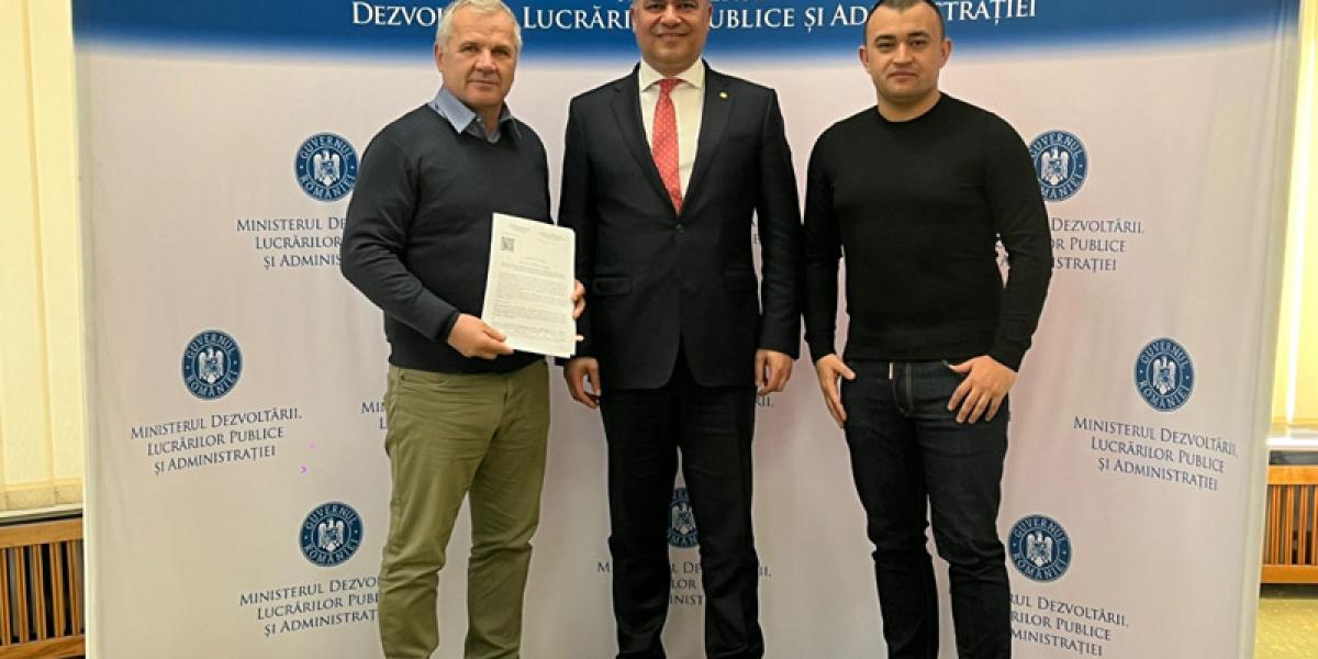 Popa a atașat comunicatului său și o fotografie realizată după semnarea contractului de finanțare la Ministerul Dezvoltării.