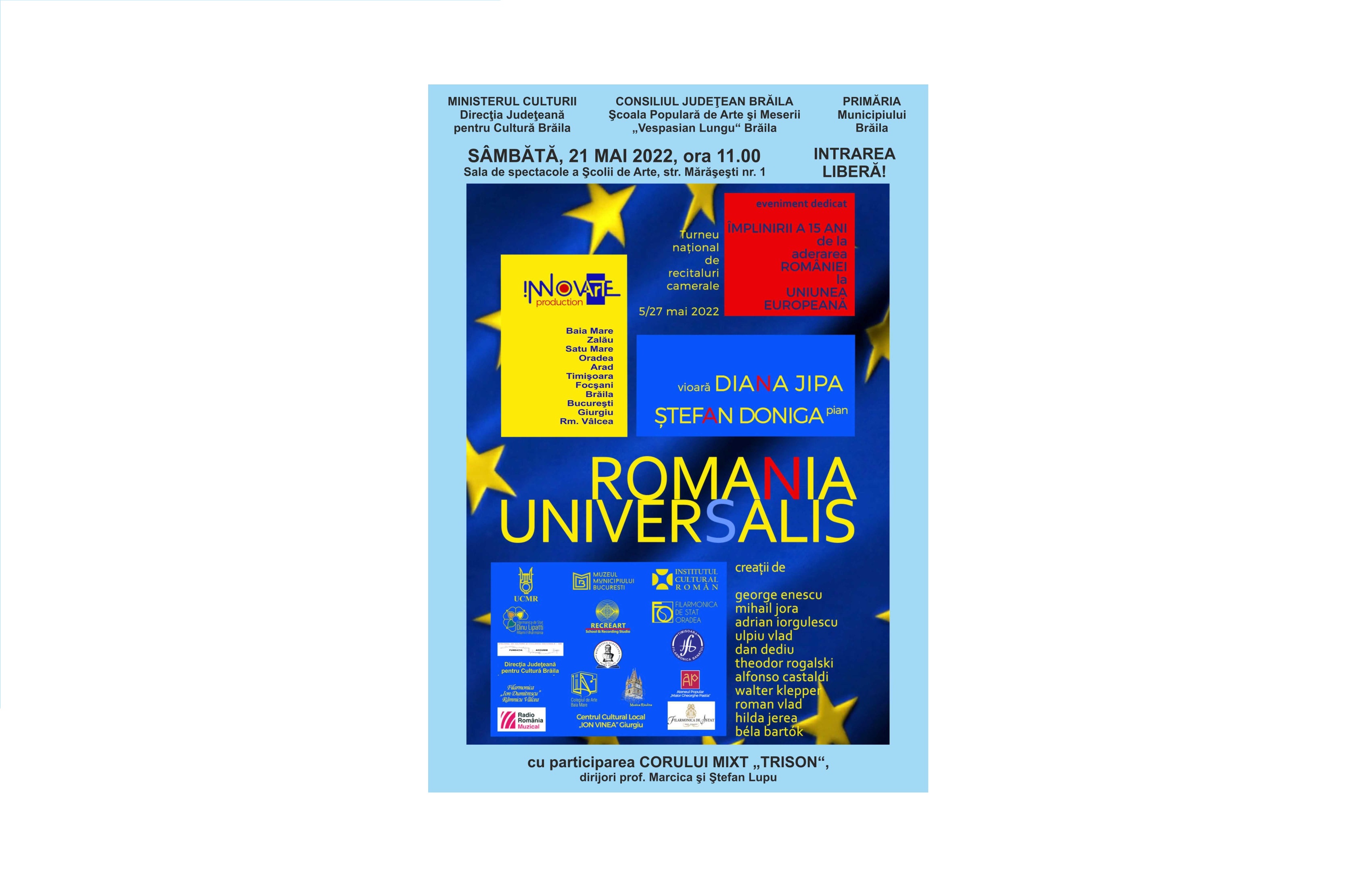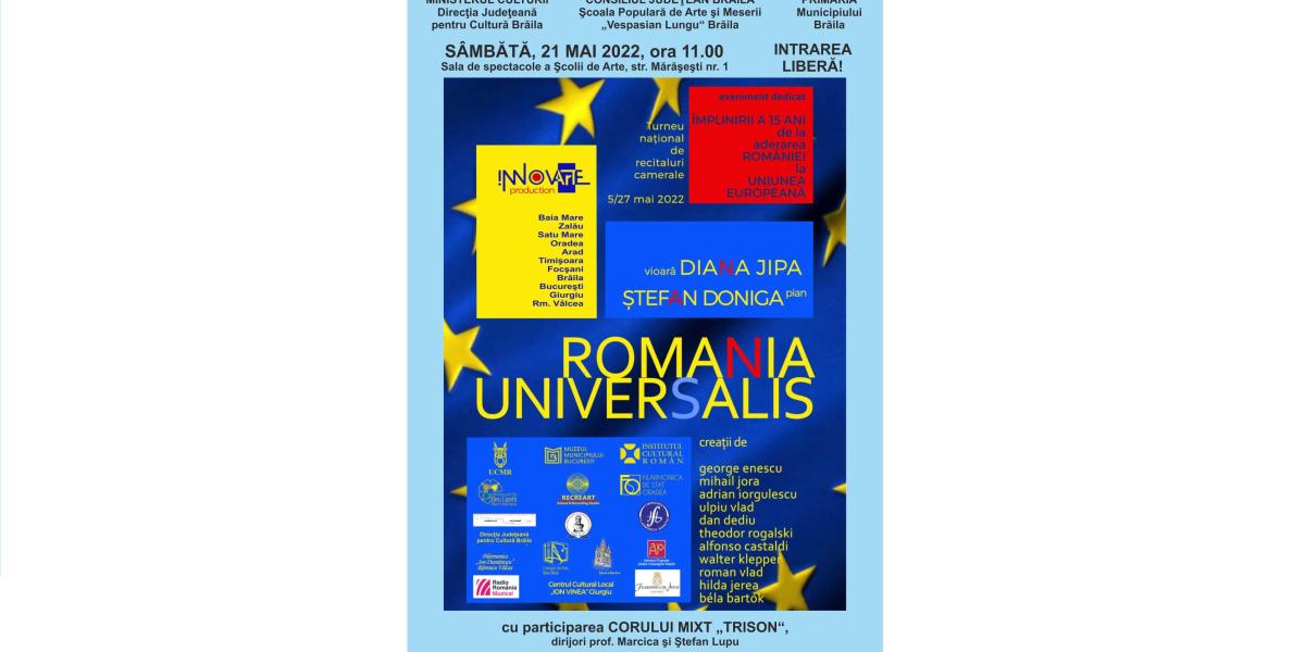 Potrivit reprezentanților Școlii de Arte „Vespasian Lungu” Brăila, turneul „România universalis” este organizat, pe plan naţional, de Asociația Culturală Innovarte, cu sprijinul Institutului Cultural Român şi al Uniunii Compozitorilor și Muzicologilor din România. Recitalul cuprinde creații camerale semnate de George Enescu, Bela Bartok, Walter Klepper, Mihail Jora, Alfonso Castaldi, Theodor Rogalski, Hilda Jerea, dar și creații aparținând compozitorilor Adrian Iorgulescu, Ulpiu Vlad, Dan Dediu şi Roman Vlad.