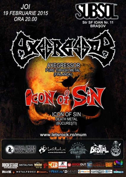 Două trupe excelente din zona metalului underground vor concerta astăzi în Braşov. Este vorba despre thrasherii finlandezi de la Axegressor şi trupa bucureşteană de death metal Icon of Sin, grup care îşi face reapariţia pe scenă după o pauză de 15 ani. Evenimentul este găzduit de clubul Subsol din Braşov (str. Sf. Ioan Nr. 11 - zona Piaţa Sfatului), accesul publicului se va face de la ora 20.00, iar concertul este programat să înceapă la ora 21.00. Trupa Axegressor a poposit pentru prima dată în România, cu ocazia unui turneu de promovare a noului album, "Last", turneu ce a trecut deja prin Arad, Bucureşti şi Craiova. Lansat recent sub egida prestigioasei case de discuri franceze Listenable Records, CD-ul este o porţie sănătoasă de thrash metal autentic, incisiv, în cea mai pură formă. De partea cealaltă, Icon Of Sin este o surpriză a anului 2015. Foarte activă în underground-ul doom-death metal al anilor 90, formaţia a cucerit multe premii la festivalurile de profil din acele vremuri. În 1999 lansează primul material, "Not MyGod", sub emblema Bestial Records. Deşi se destramă în 2000, în toamna anului 2014 doi dintre foştii membrii (Adrian Dumitrescu - chitară şi Alex Igor - voce) refac trupa alături de Alex "Gomez" Dăscăloiu (tobe) şi Sebastian Stanciu (bas), stilul nou abordat fiind death metal.