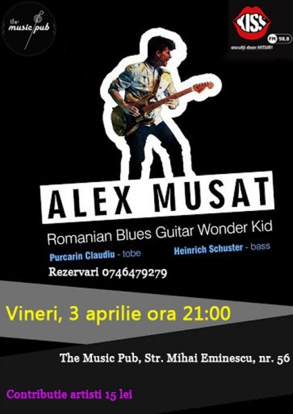 Vineri, 3 aprilie, de la ora 21.00, are loc un concert de Blues&Rock cu Alex Muşat Band în The Music Pub. Într-o formulă de trio, alături de Claudiu Purcarin, unul dintre cei mai buni toboşari din România (Nightlosers, Sistem), şi Heinrich Schuster la chitară bass, îl veţi putea vedea şi auzi pe Alex Muşat, un chitarist extrem de talentat. Acesta are 19 ani şi este elev la Liceul de Muzică "Tudor Jarda" din Bistriţa. Alex este cunoscut în rândul artiştilor români pentru modul în care cântă la chitară, pentru vocea bine calibrată şi pentru concertele pe care le susţine ca un adevărat veteran al genului. Este posibil să-l cunoaşteţi de la televizor, el apărând la mai multe emisiuni. Cunoscut şi ca "Blues Guitar wonder kid", Alex spune că a deprins pasiunea pentru acest instrument muzical acasă. "În ultima vreme, studiez foarte mult singur şi îmi place foarte mult. Mă simt atras de stilul ăsta de muzică, chiar dacă ştiu că nu e foarte cunoscut pe la noi, dar mă regăsesc în muzica blues, country şi rocknroll", spune tânărul.