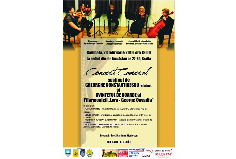 Sâmbătă, 23 februarie 2019, de la ora 18.00, la “Poarta Cetăţii” din strada Ana Aslan, nr. 27-29, este programat un Concert Cameral susţinut de Gheorghe Constantinescu, la clarinet şi Cvintetul de coarde al Filarmonicii “LYRA -George Cavadia”, eveniment care va fi prezentat de profesor Marilena Niculescu.