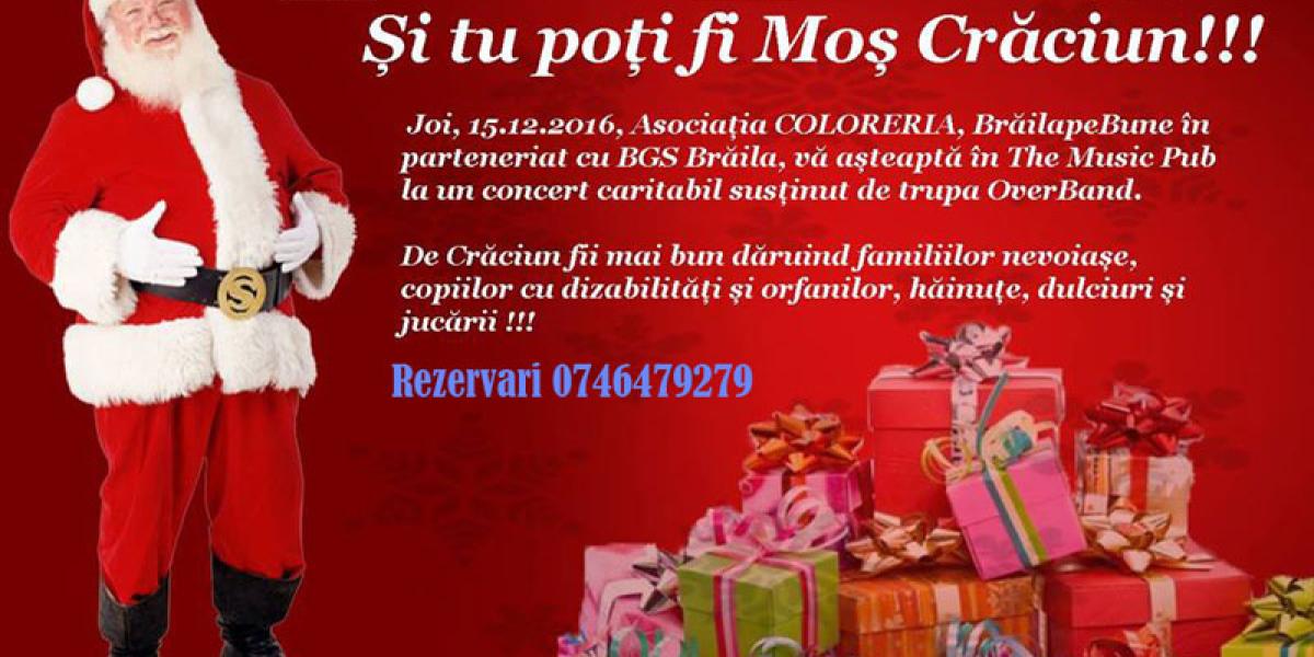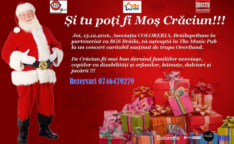 „Ne-am gândit că Moş Crăciun nu-i poate ocoli pe copiii orfani, pe cei cu dizabilităţi sau pe cei care provin din familii nevoiaşe. Sunt copii minunaţi, iubitori care îţi sar în braţe şi îţi sunt recunoscători pentru puţinul pe care îl poţi oferi pentru ei. Copiii ajutaţi de voi locuiesc în Brăila, în cartierele sărace, majoritatea fac parte din familii monoparentale, fără posibilităţi, cu 4-5 copii. Asociaţia COLORERIA în colaborare cu BGS, BrailapeBune şi The Music Pub organizează joi, 15 decembrie, un concert caritabil cu Over Band prin care încercăm să le facem acestor copii sărbătorile de iarnă cu adevărat fericite.