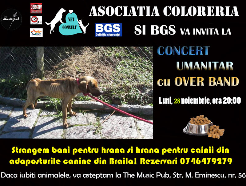 • este vorba despre un spectacol special al trupei gălăţene Over Band, în cadrul unei acţiuni a Asociaţiei Coloreria, în colaborare cu BGS - Divizia de Securitate şi Vet Consult • evenimentul va avea loc luni, 28 noiembrie, la ora 20:00, pe scena The Music Pub • iubitorii de animale pot dona bani cu această ocazie pentru hrana câinilor cazaţi în adăposturile din Brăila