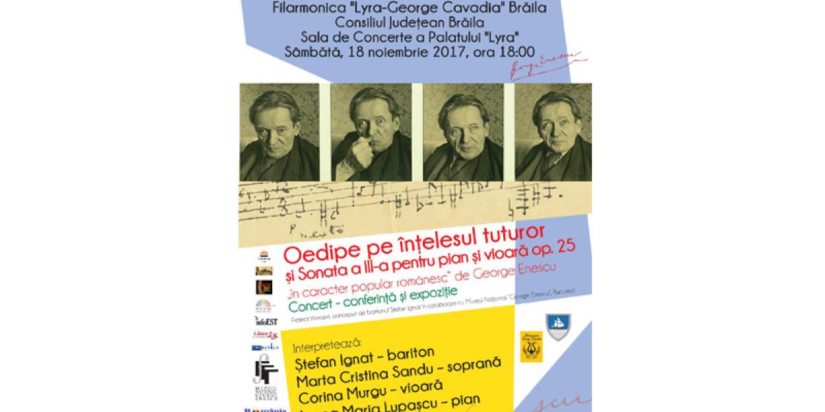 Filarmonica “Lyra-George Cavadia” Brăila prezintă sâmbătă, 18 noiembrie 2017, începând cu ora 18:00, în Sala de Concerte a Palatului “Lyra” spectacolul “Oedipe pe înţelesul tuturor” şi Sonata a III-a pentru pian şi vioară Op. 25 - în caracter popular românesc de George Enescu.