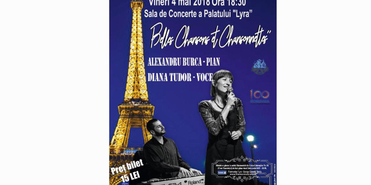 Vineri, 4 mai, începând cu ora 18:30, în Sala de concerte a Palatului “Lyra”, va avea loc un concert de chansonete şi tangouri interbelice “Belles Chansons et Chansonnettes”, în interpretarea de excepţie a artiştilor Diana Tudor - voce şi Alexandru Burcă - pian.