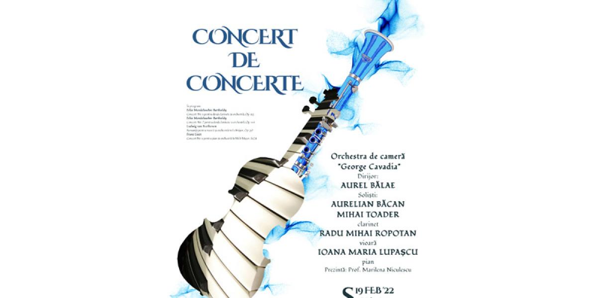 * evenimentul, intitulat "Concert de Concerte", are loc sâmbătă, 19 februarie a.c., cu participarea Orchestrei de Cameră "George Cavadia" și a artiștilor Ioana Maria Lupașcu, Aurelian Băcan, Mihai Toader și Radu Mihai Ropotan