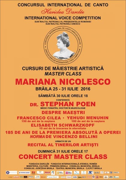 Duminică, 31 iulie, de la orele 17.00, cu Mariana Nicolesco în scenă, va avea loc Concertul Master Class în care vor da măsura progreselor făcute şi vor fi aplaudaţi toţi participanţii la ediţia 2016 a Cursurilor de Măiestrie Artistică.