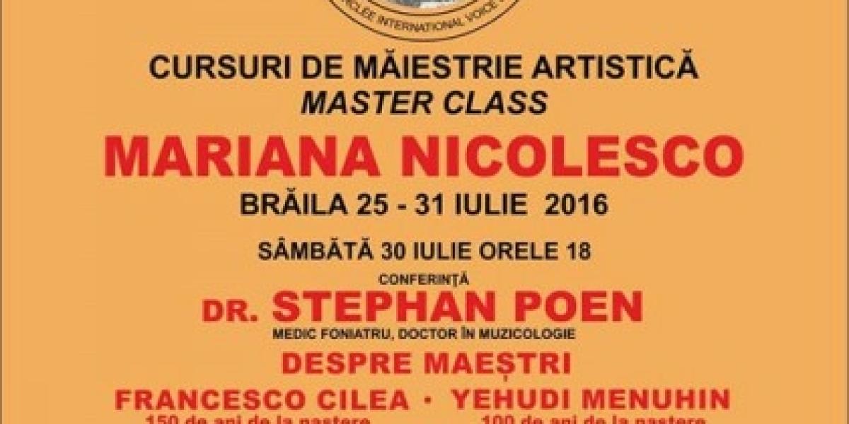 Ediţia din acest an a Cursurilor de Măiestrie Artistică, Master Classes Mariana Nicolesco, desfăşurată începând din 25 iulie şi până pe data de 31 iulie, este aşezată sub semnul relaţiei Maeştri - Discipoli, cheia transmiterii marilor tradiţii ale artei cântului.