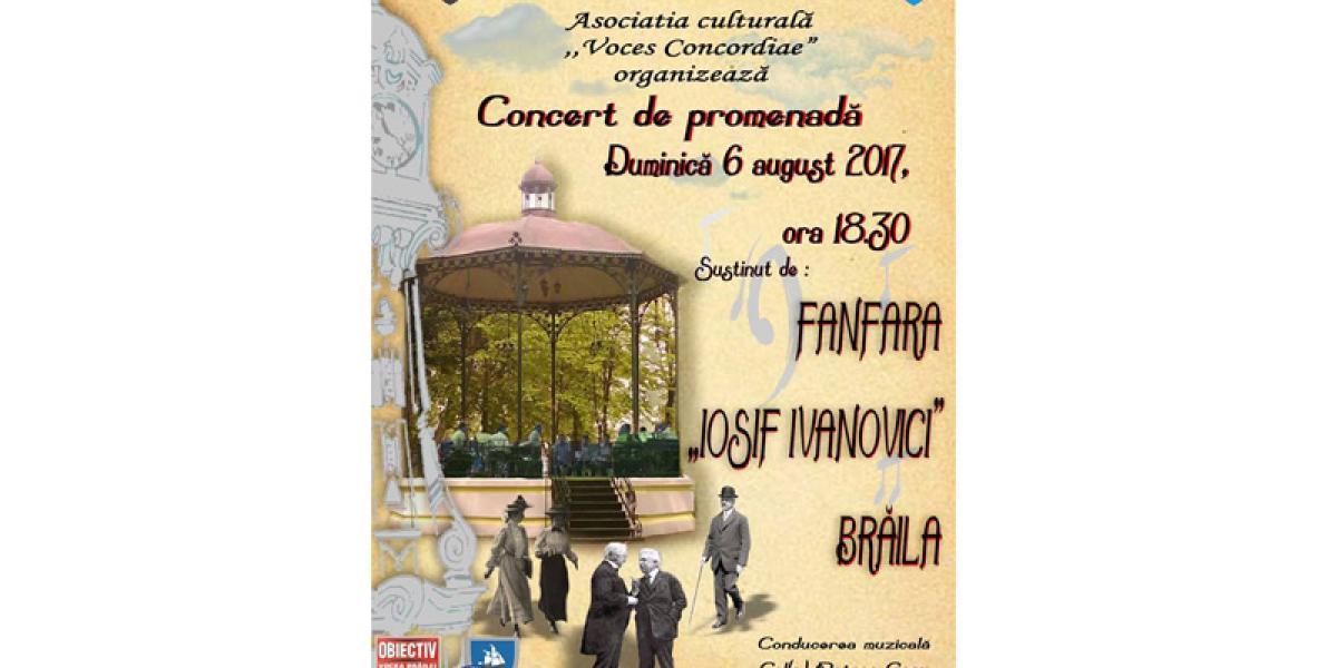 Duminică, 6 august 2017, de la ora 18.30, la Chioşcul din Grădina Publică va avea loc un concert de promenadă susţinut de fanfara “Iosif Ivanovici”, sub bagheta dirijorului Petrea Gogu. Evenimentul este inclus în proiectul “În parc fanfara cânta. Seri muzicale camerale” desfăşurat de Asociaţia Culturală “Voces Concordiae” Brăila şi este finanţat de Primăria Municipiului şi Consiliul Judeţean Brăila.
