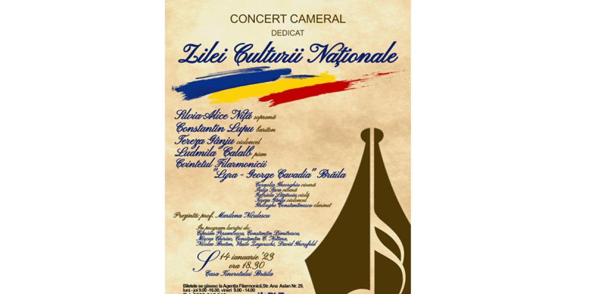 „Ziua Culturii Naționale reprezintă un moment de redescoperire a valorilor, a identității și amprentei românești, de reconectare cu muzica și cultura națională, filon al ființei și suflului nostru. Filarmonica „Lyra - George Cavadia” Brăila, susținută de Consiliul Județean și Primăria Municipiului Brăila marchează această incursiune către universul valoric al națiunii noastre printr-un Concert Cameral în care invitați cunoscuți și îndrăgiți de dumneavoastră vă vor transmite prin graiul muzicii simțirile din spatele repertoriului valoros abordat”, precizează, într-un comunicat, prof. Alexandra Gurgu, secretarul muzical al Filarmonicii „Lyra - George Cavadia” Brăila.
