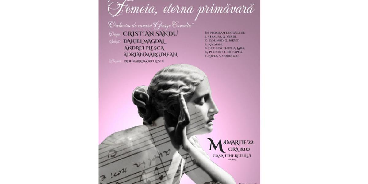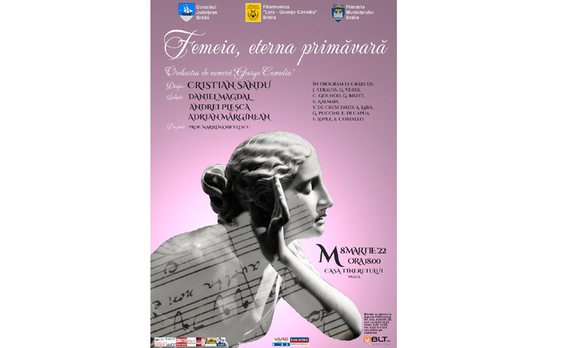 Concert de Ziua Internațională a Femeii pe scena Casei Tineretului din Brăila, organizat de Filarmonica "Lyra-George Cavadia" în parteneriat cu Consiliul Județean și Primăria Municipiului Brăila. Evenimentul este intitulat, sugestiv, "Femeia, eterna Primăvară".