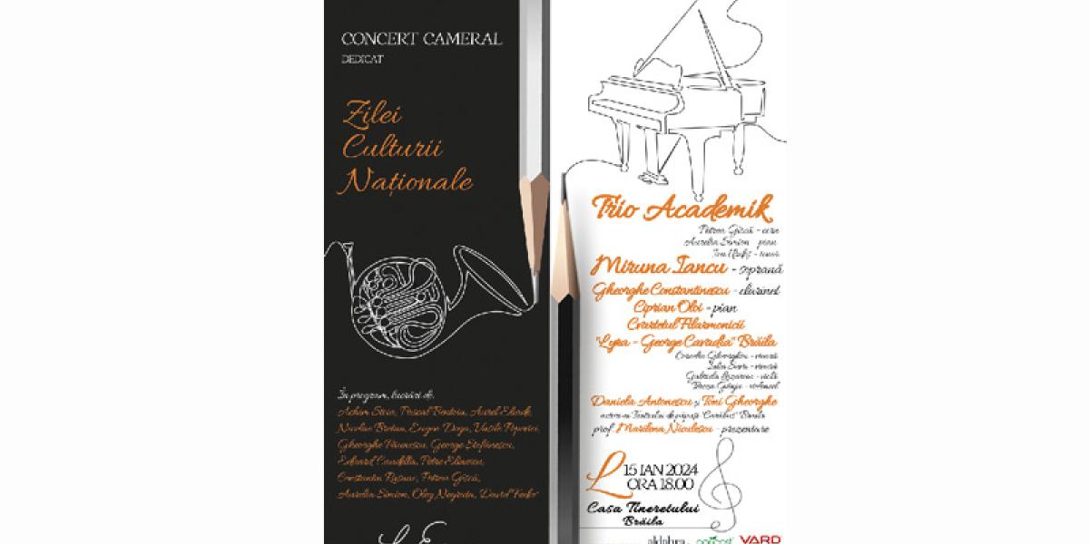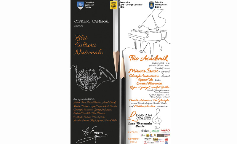 Concert cameral de excepție, organizat cu ocazia Zilei Culturii Naționale a României. Astfel, Filarmonica „Lyra - George Cavadia” Brăila, alături de Consiliul Judeţean și Primăria Municipiului Brăila, îi invită pe brăilenii iubitori de muzică de calitate la un regal de muzică și poezie dedicat Zilei Culturii Naționale, susținut la Casa Tineretului de pe Calea Călărașilor, în ziua de luni, 15 ianuarie 2024, ora 18.00.