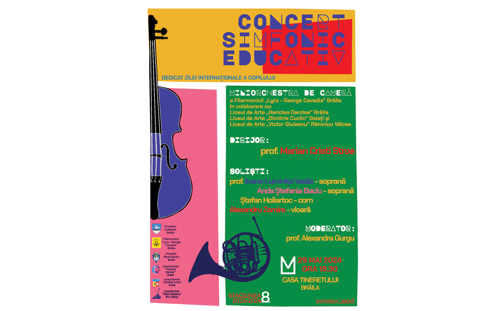 Toți cei prezenți la concert vor fi martorii unor momente muzicale aparte, alături de Miniorchestra de cameră a Filarmonicii „Lyra - George Cavadia”, dirijată de prof. Marian Cristi Stroe, și de soliștii: prof. Ioana-Luminița Vasile (soprană), Anda Ștefania Baciu (soprană), Ștefan Holiartoc (corn, Galați) și Alexandru Zamira (vioară, elev al Liceului de Arte „Haricleea Darclee” Brăila).