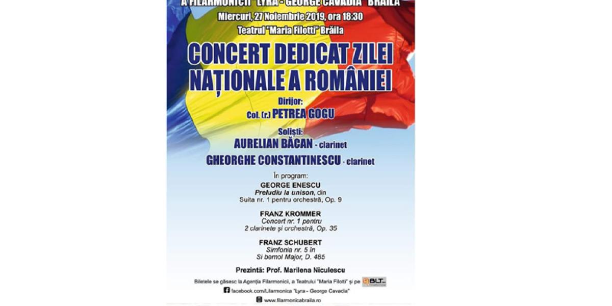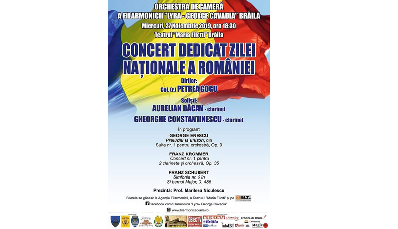 Miercuri, 27 Noiembrie 2019, de la ora 18:30, în Sala Mare a Teatrului “Maria Filotti” Brăila, Orchestra de Cameră a Filarmonicii “Lyra-George Cavadia dirijată de col(r) Petrea Gogu va susţine un Concert dedicat Zilei Naţionale a României.